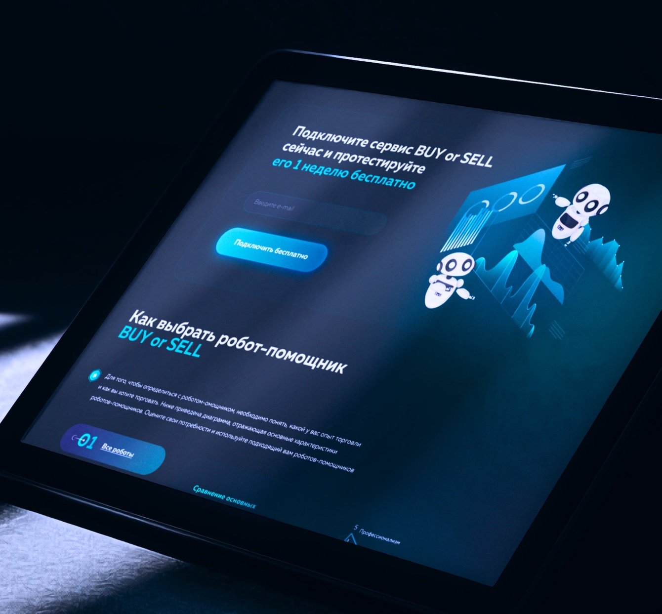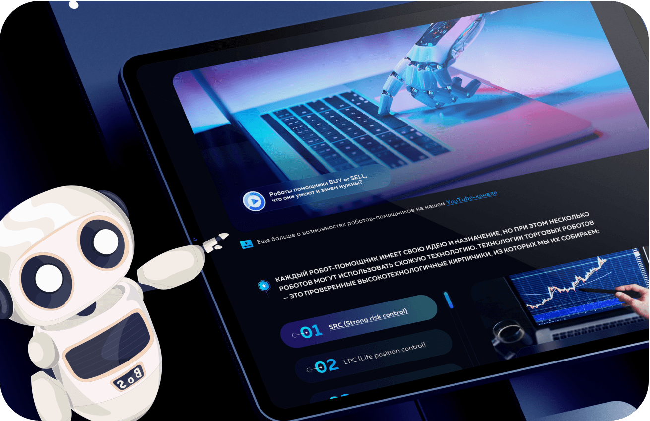 Несмотря на то, что роботы BoS безэмоциональны, нам хотелось показать их максимально включенными в процесс помощниками. Создать ощущение, что они как бы в одной команде с трейдером и по-настоящему заинтересованы в его результате. Чтобы добиться такого эффекта, в зависимости от содержания контента блока меняли положение рук роботов, определяли их расположение относительно других визуальных элементов и текста, дополняли общую картинку мелкими деталями.