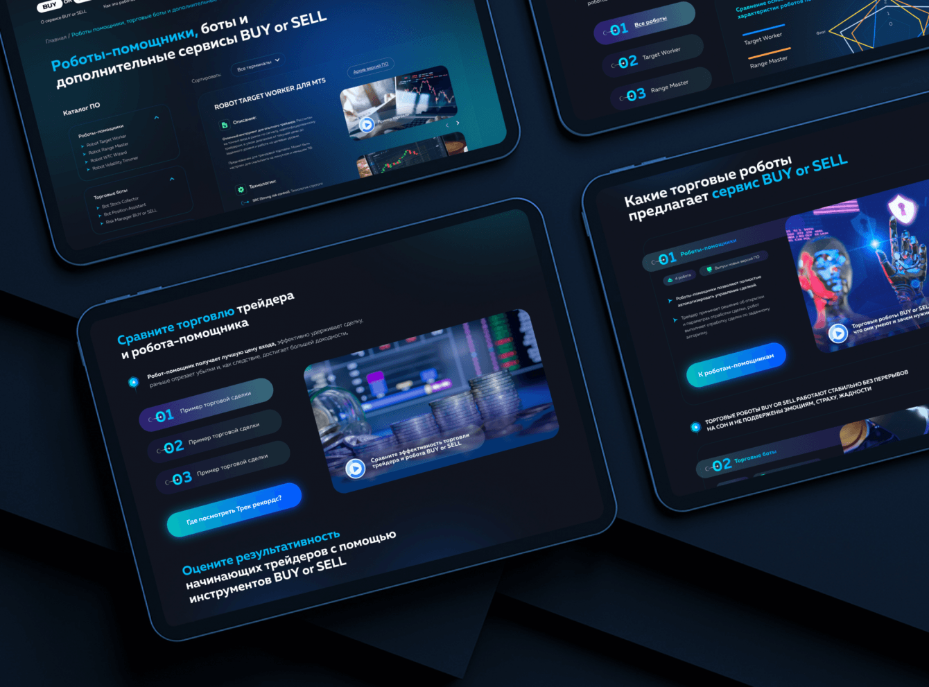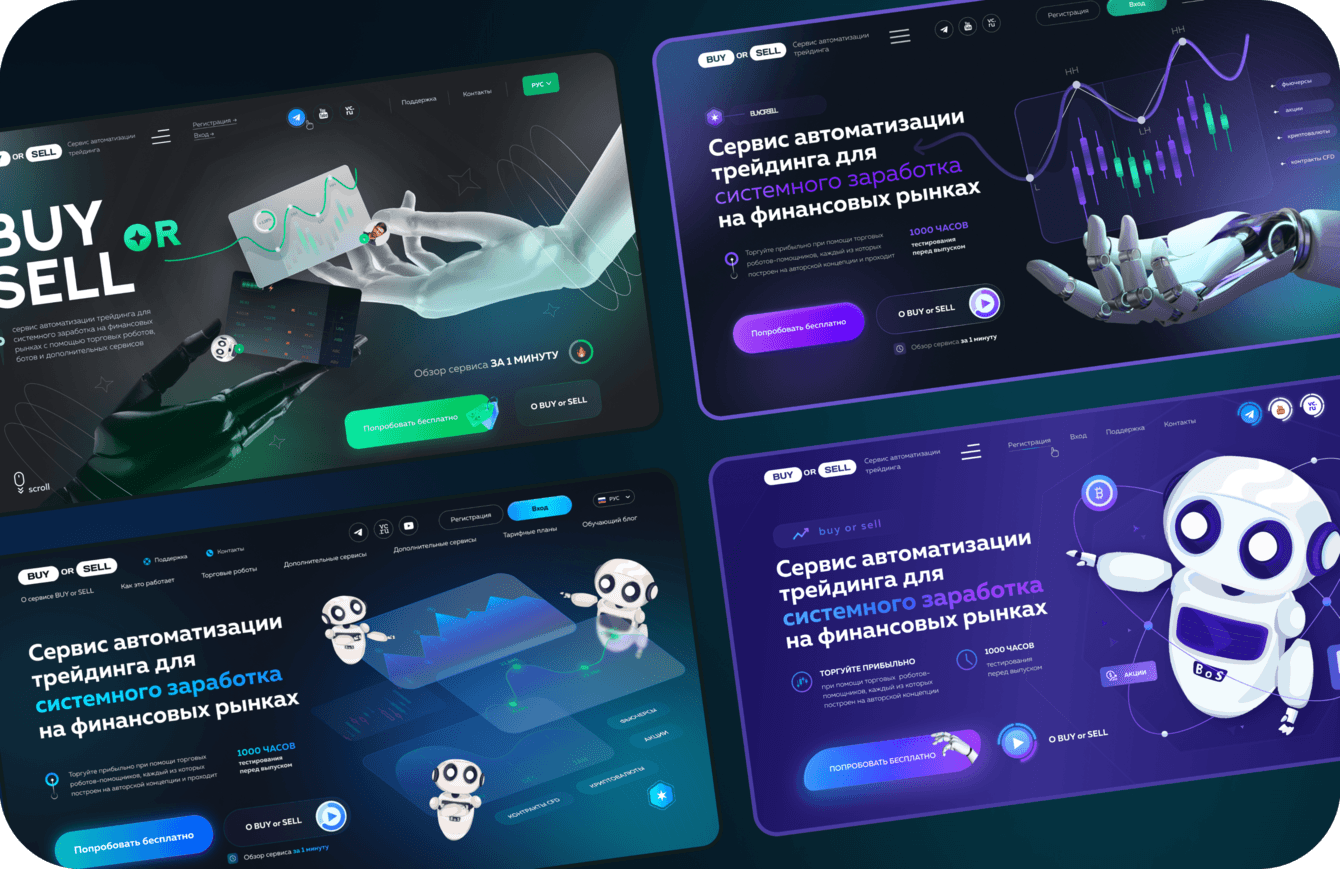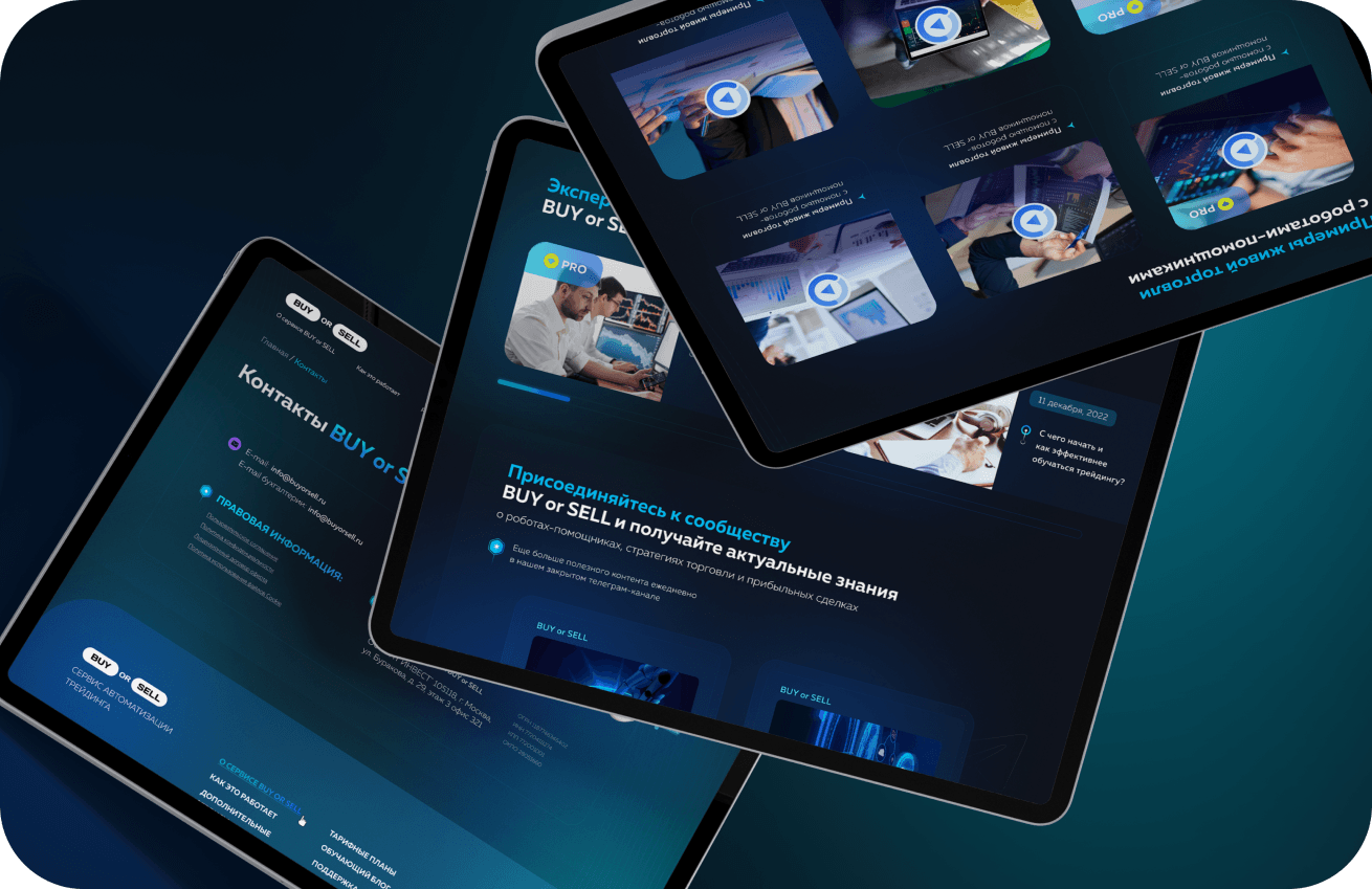 Разработали многостраничный сайт и личный кабинет новаторской платформы BUY or SELL с амбициозным хай-концептом: симбиоз человека и компьютера для эффективного управления сделками. Сервис предоставляет доступ к торговым роботам-помощникам, автоматизируя торговлю фьючерсами, акциями, криптовалютами, контрактами CFD рынка FOREX и позволяя повысить вероятность заработка в 10 раз.