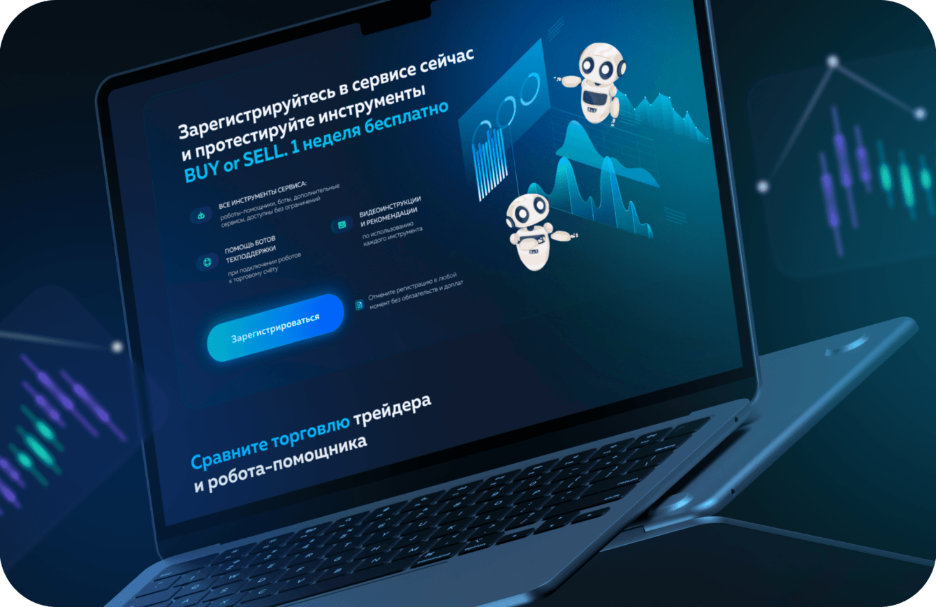 Авторская концепция работы интеллектуальных помощников. Обычно под торговыми роботами понимают полностью автоматические торговые программы, которые открывают сделку и самостоятельно принимают решение о покупке или продаже актива. Такой софт не может на 100% эффективно управлять торговлей, так как в нем отсутствует система обратной связи, он не находится в контексте рынка и торгует механически. Роботы-помощники BUY or SELL работают не вместо, а вместе с трейдером, который видит рынок и понимает контекст. Не вмешиваясь в процесс анализа и принятия торгового решения, ИИ-помощник позволяет полностью автоматизировать дальнейшее управление сделкой.