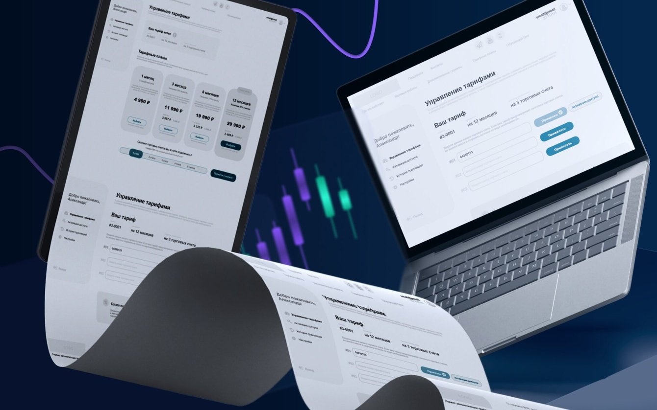 Раздел 1: управление тарифами. В этом разделе пользователь может увидеть всю информацию о приобретаемом тарифе, сохранить данные своих торговых счетов, к которым будут привязаны торговые роботы, при необходимости — подключить дополнительные торговые счета. Кроме базовой информации, разбитой на понятные смысловые блоки, добавили плашку с отсчетом, сколько дней осталось до окончания действия тарифа, и акцентную плашку с предложением добавить дополнительный торговый счет со скидкой 30%.