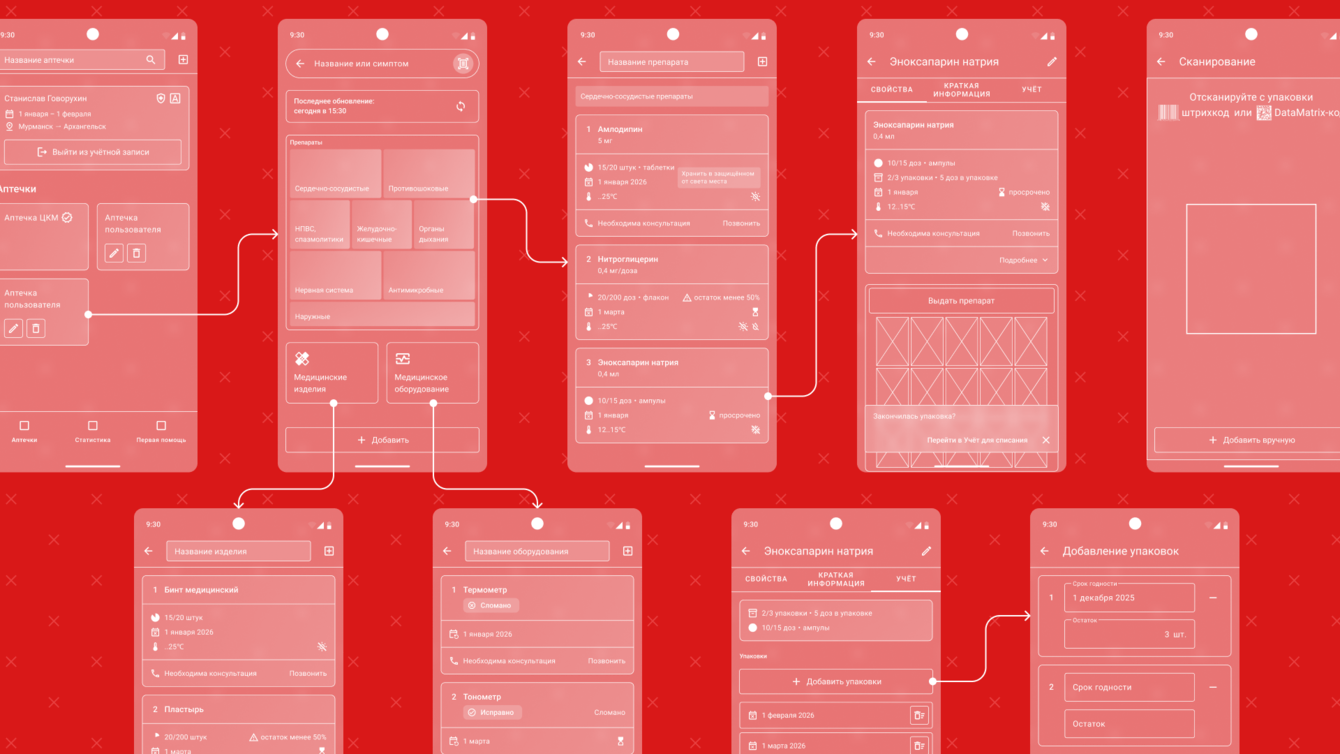 В Figma мы собрали low/medium-fi вайрфреймы для всех ключевых сценариев: выбор объекта/судна, работа с аптечками, сканирование штрих-/DataMatrix-кодов, поиск по названию и симптомам, учёт партий и сроков, выдача/списание, проверка оборудования, генерация отчётов и инструкции по первой помощи.