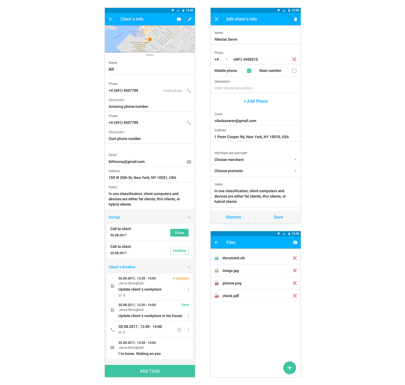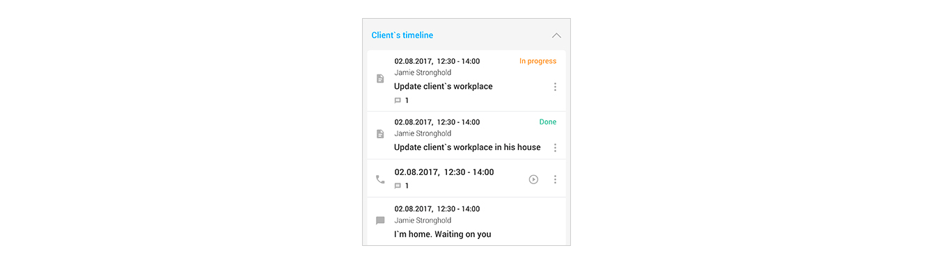 Из вкладки «Tasks» можно попасть на страничку «Client’s info», чтобы посмотреть и/или отредактировать данные о клиенте. Здесь находятся контакты заказчика, информация о его событиях и задачах, история изменения статуса заявок и ход их выполнения. Также можно посмотреть историю звонков и прослушать их записи. К каждому заказчику можно прикрепить разные файлы (документы, картинки и др.), выбрав их в окне «Files».
