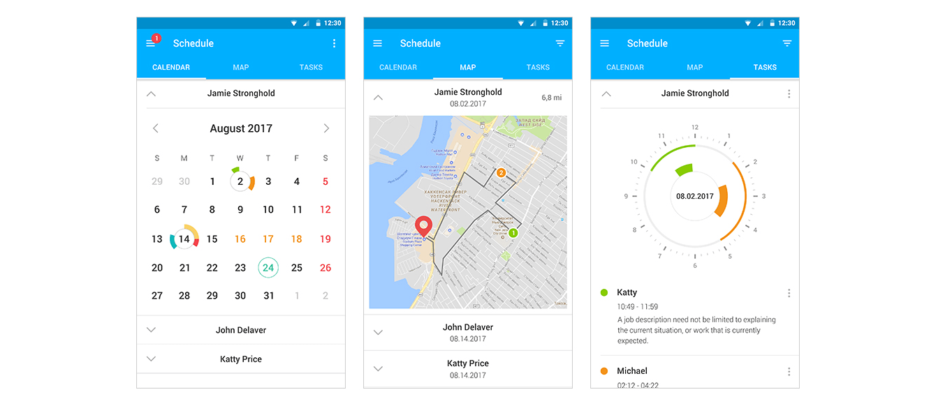 Основная зона действия – экран «Schedule» (График), который состоит из трех вкладок: «Calendar» (Календарь), «Map» (Карта) и «Tasks» (Задачи) .
