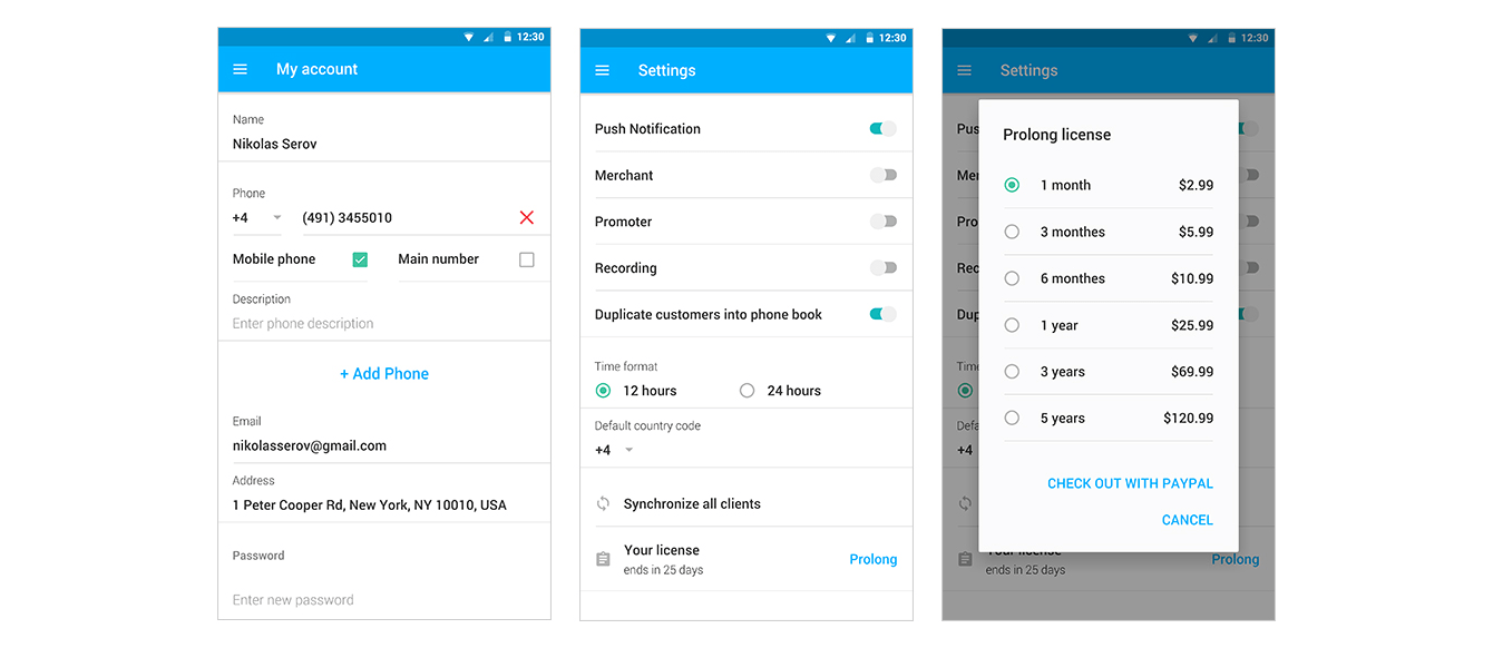 На страничке «My Account» можно изменить свои личные данные, а на экране «Settings» задать настройки: включить/выключить автоматическую запись звонков и сохранение контактов заказчика в телефонную книгу, выбрать тип отображения для экрана «Tasks» и отрегулировать другие параметры.