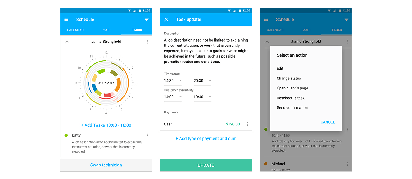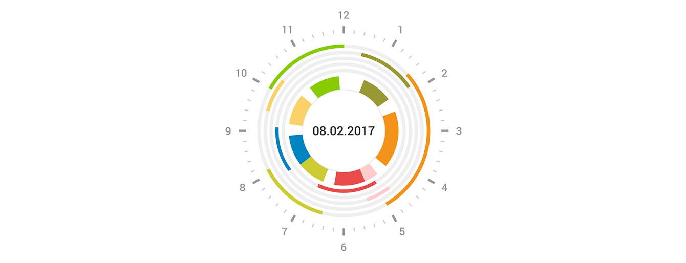 Каждый клиент на круге отмечается определенным цветом. Закрашенный сектор соответствует промежутку времени, которое исполнитель потратит на исполнение заявки. Цветная линия под сектором с задачей показывает свободное время клиента. Техник видит у себя в приложении такой же график, но с отображением только своих задач.