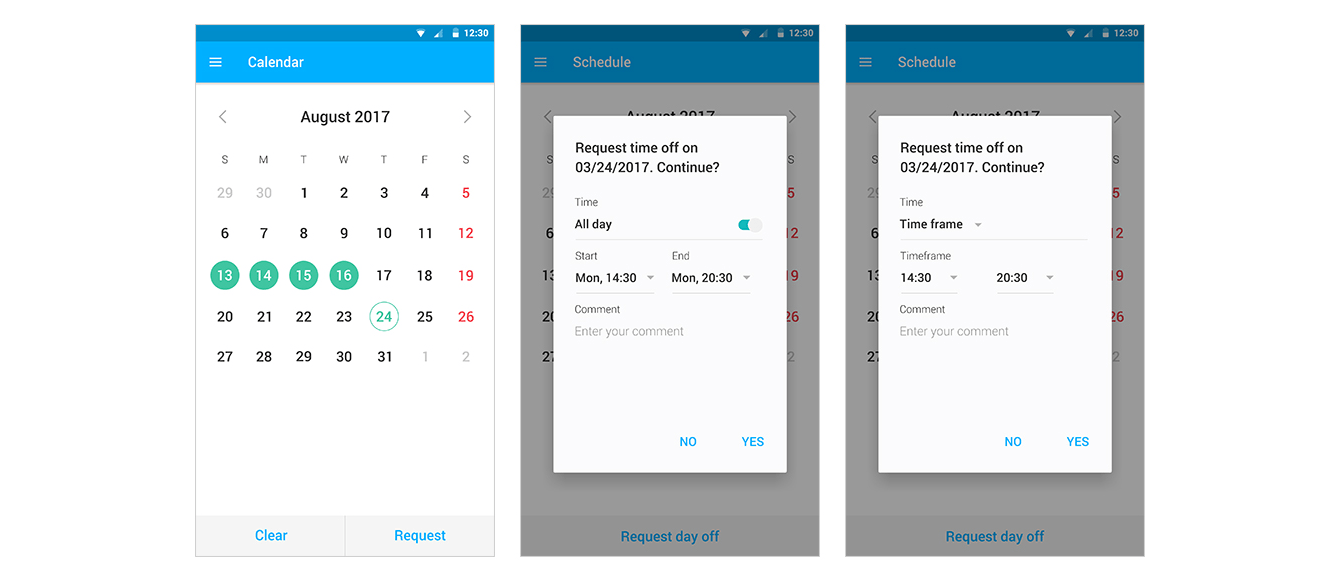 Техник на экране «Schedule» видит информацию о назначенных на него заявках, может запросить или отменить выходной.