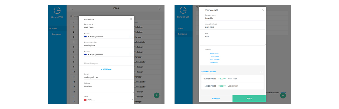 Администраторам также доступна веб-часть системы, разработанная для работы с компьютера. Веб-интерфейс позволяет работать с пользователями SimpleFSM, добавлять новых клиентов и управлять их лицензиями – доступом к мобильному приложению.