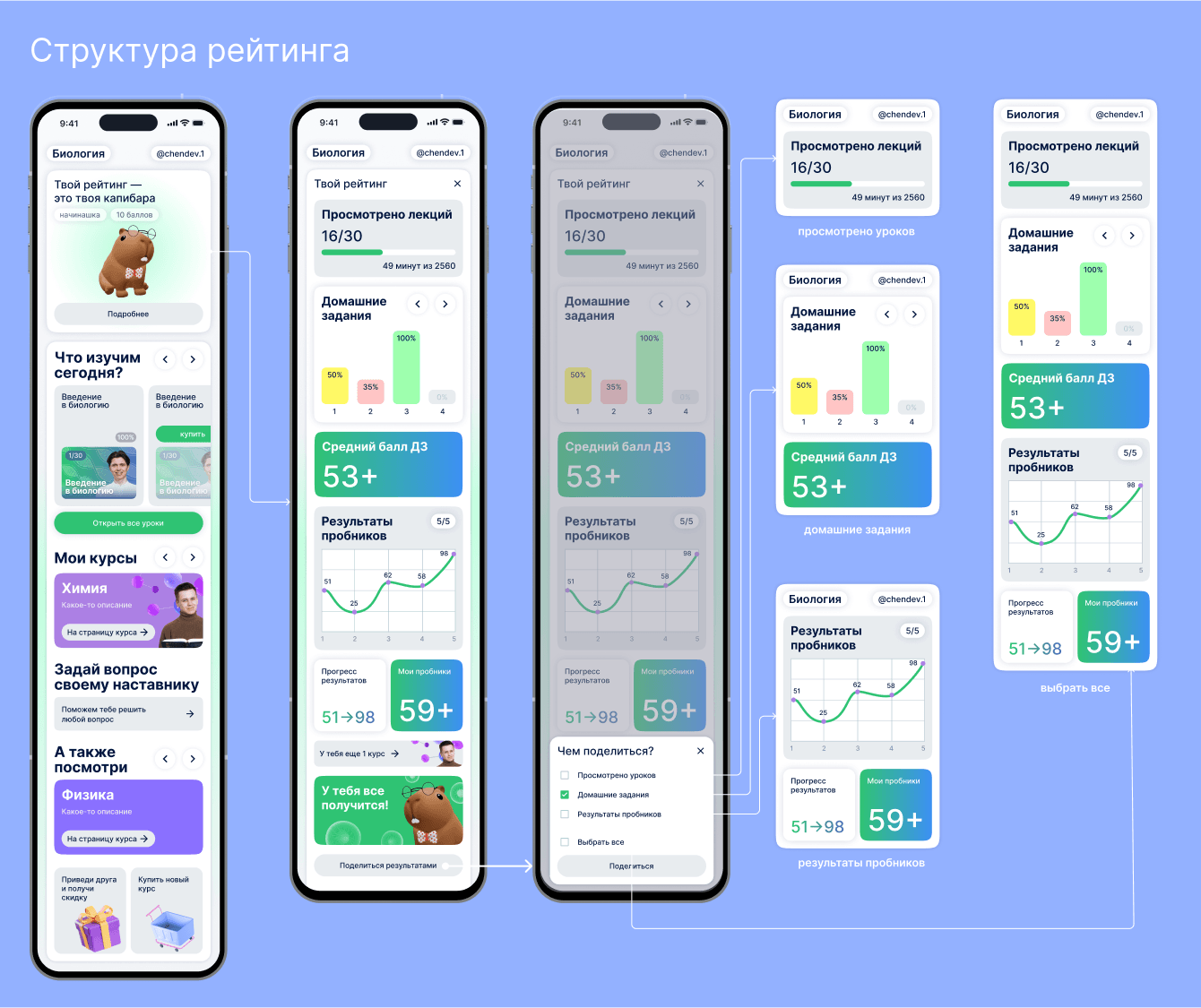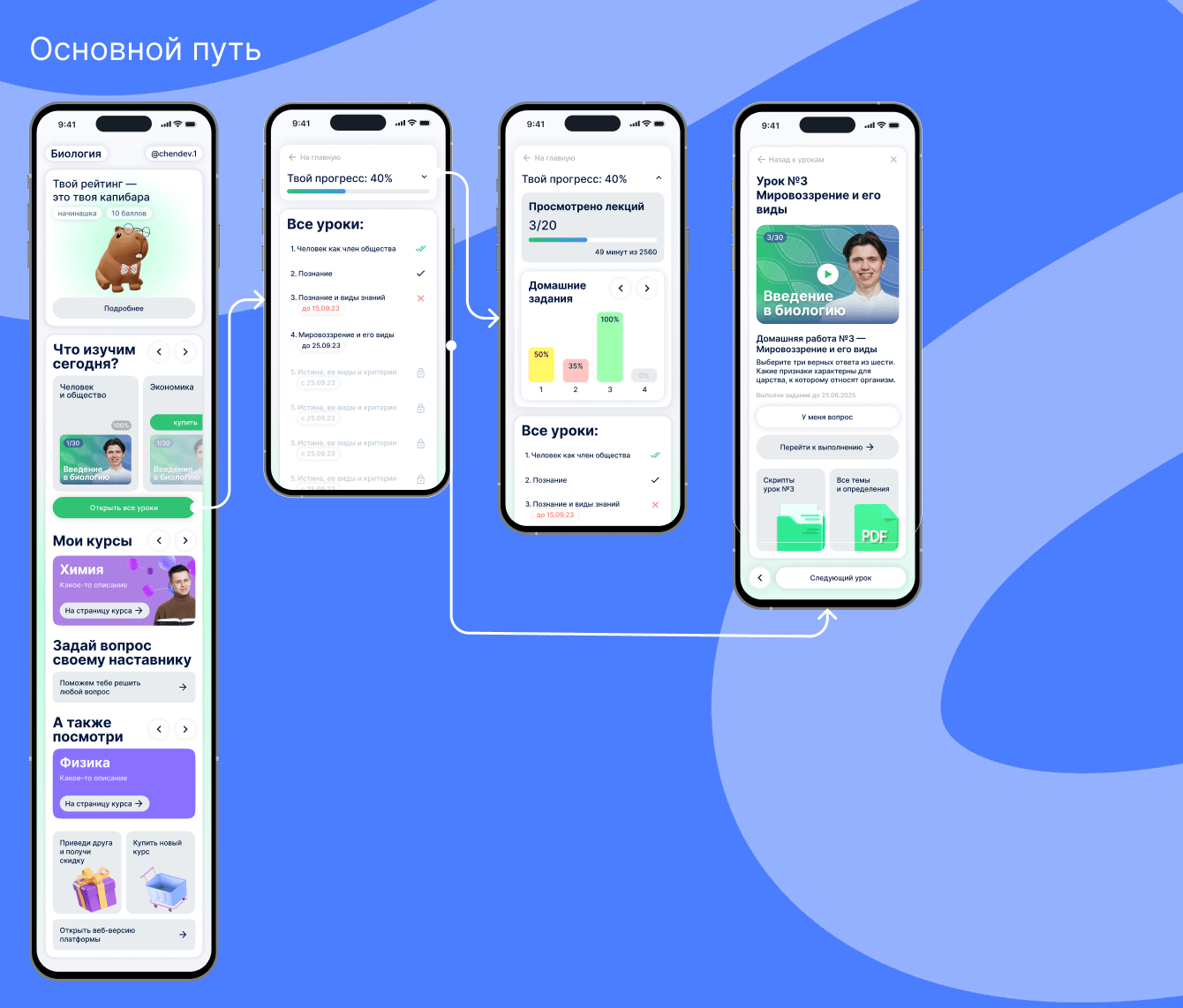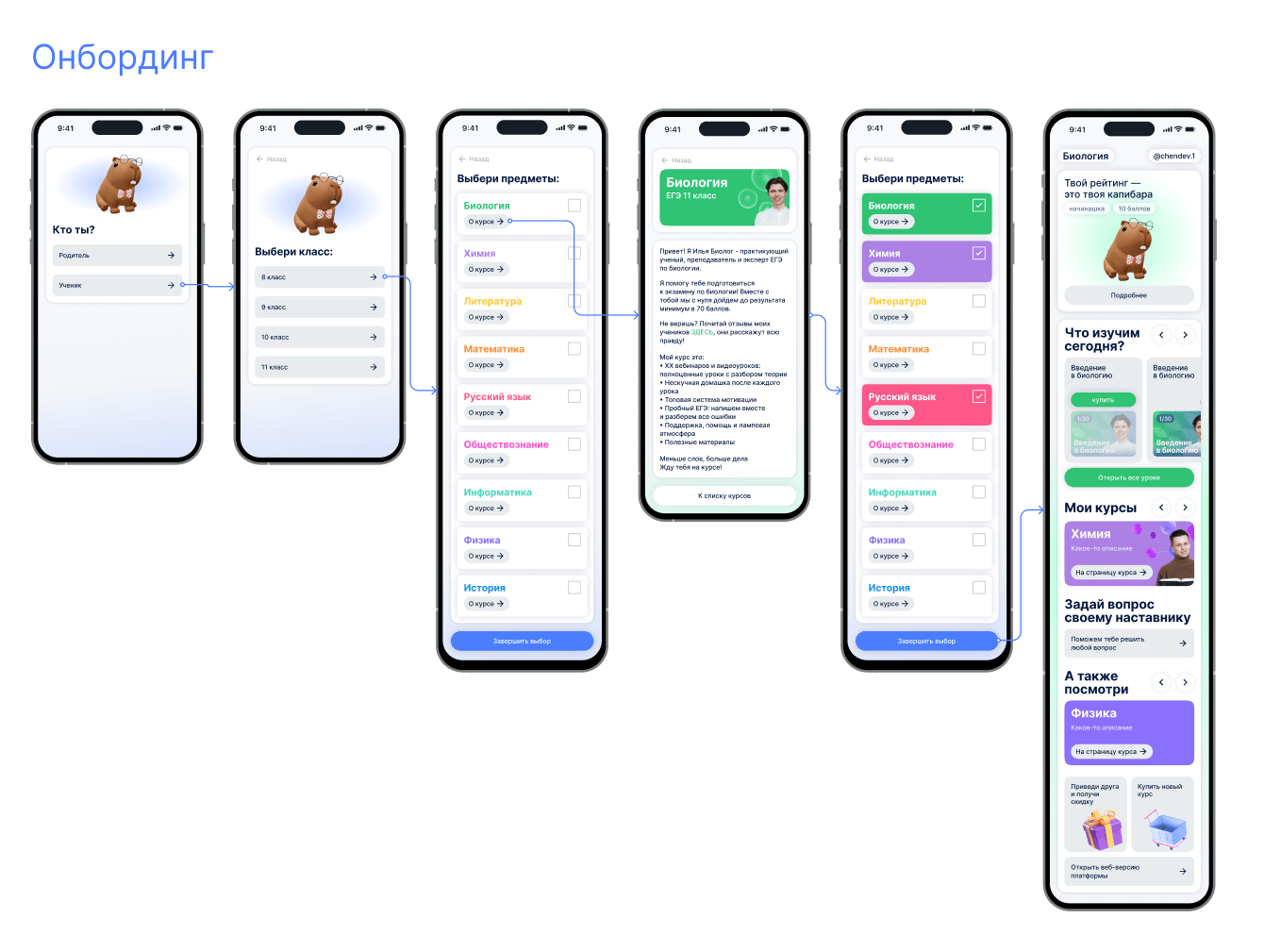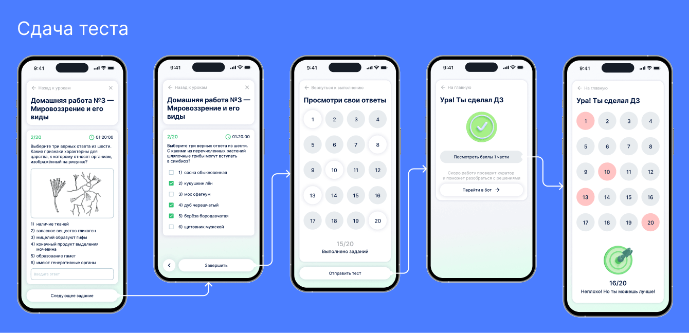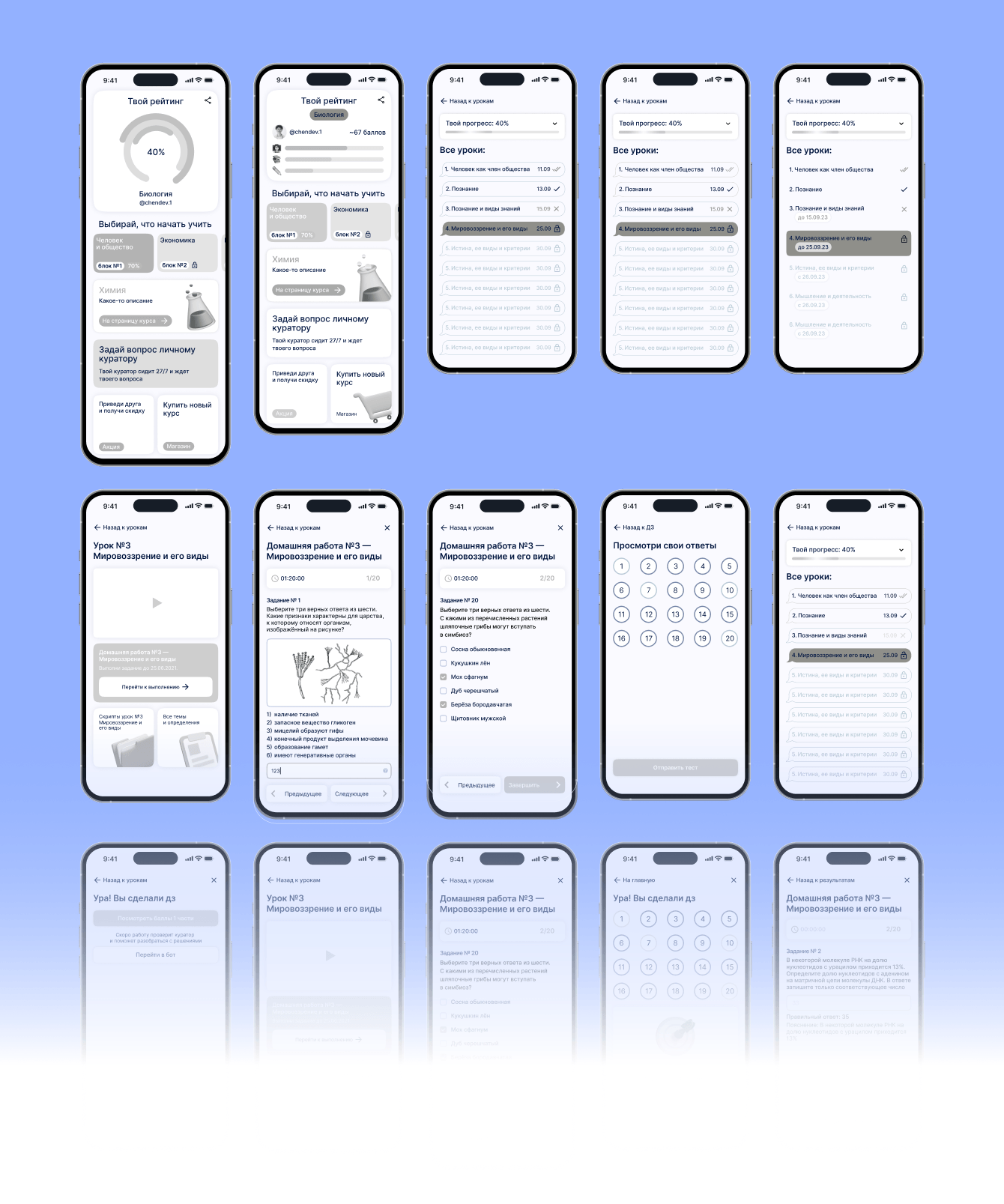 При проработке UX/UI мы упростили регистрацию, добавили возможность выбора нескольких направлений и функцию быстрого обмена статистикой. Также предусмотрели разные форматы тестов и учебных материалов, чтобы преподаватели могли легко загружать и управлять контентом в мобильной версии.