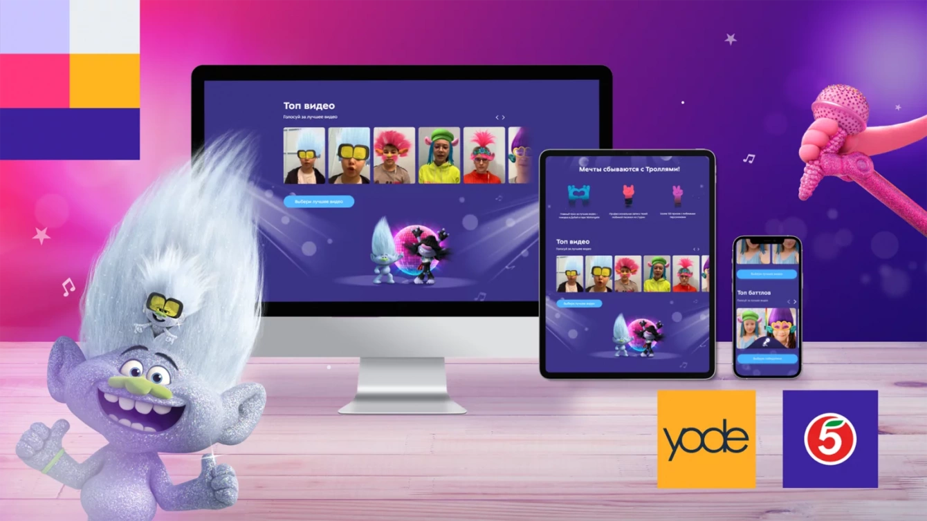 - Игровая механика мобильного приложения «Тролли.Караоке» включает распознавание карточек, AR-маски, AR-караоке и интеграцию с сервером, на который загружаются и проходят модерацию видеозаписи пользователей, интеграцию с промо-сайтом, на котором проходит голосование за караоке-видео и караоке-баттлы.