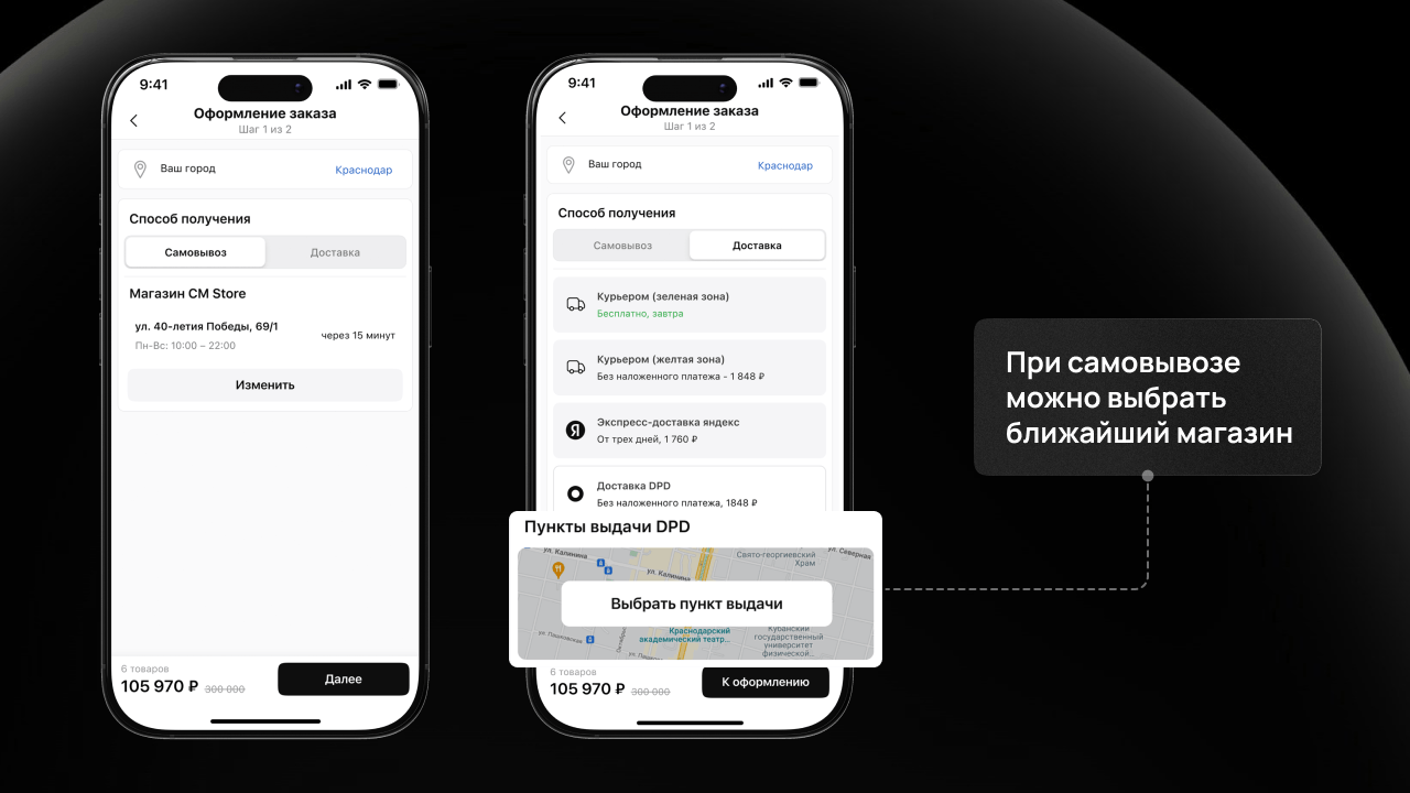 В приложении есть самовывоз и доставка. Если в городе пользователя нет физического магазина, то приложение автоматически предложит только доставку товара. Если в городе пользователя есть магазин и можно оформить самовывоз, то есть два варианта для удобства покупателей: