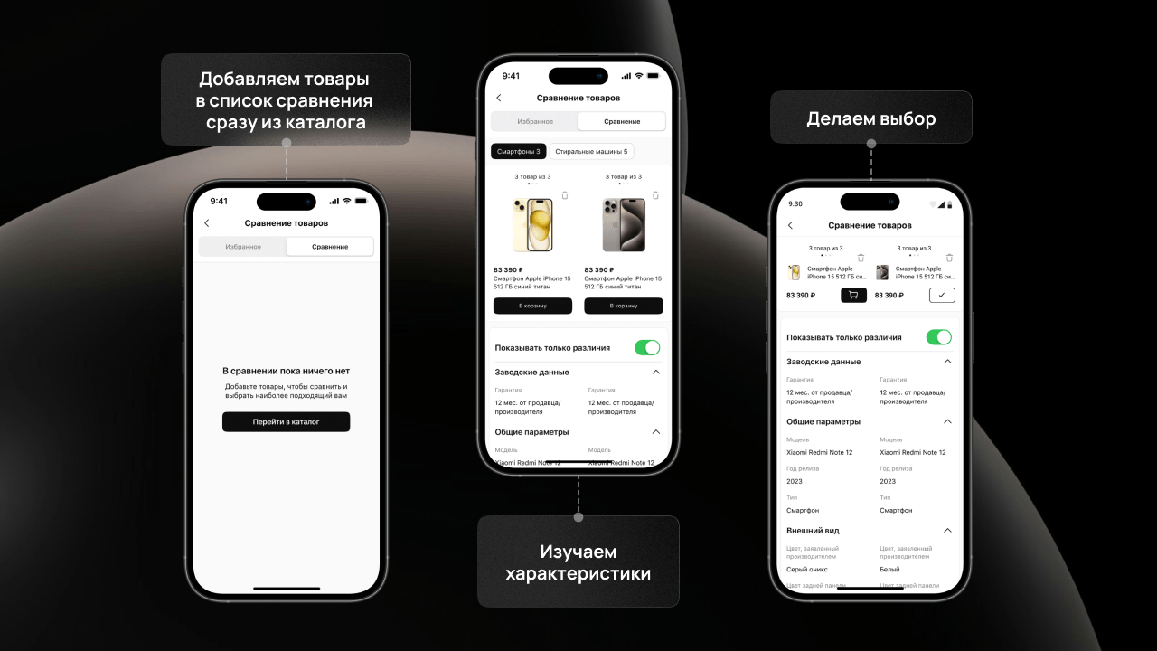 Чтобы выбрать между несколькими понравившимися товарами, можно добавить их в список сравнения, чтобы изучить характеристики и отфильтровать только те, которые отличаются. Если список сравнения пуст, то можно добавлять товары прямо из каталога.