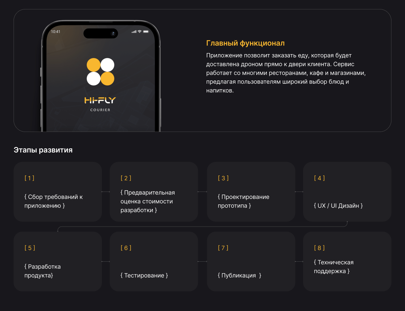 Мы начали с анализа требований и запросов клиента, затем провели исследование рынка и пользовательских потребностей в области доставки еды. После этого мы разработали концепцию приложения и создали прототип, чтобы оценить пользовательский опыт. После утверждения прототипа мы приступили к разработке приложения, сначала реализовав основные функциональности, такие как просмотр меню и оформление заказа, а затем интегрировав систему управления доставкой дронами.