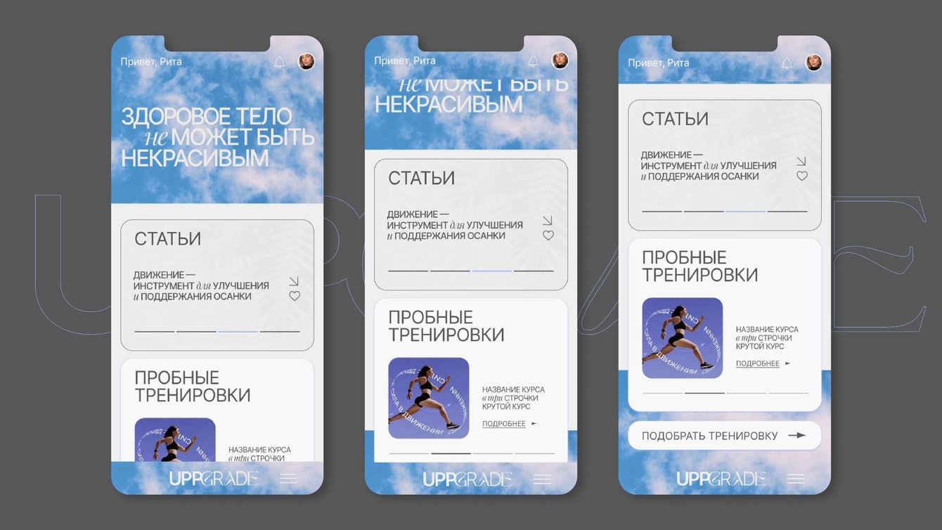Дизайн: разработаны брендбук и макеты приложения по страницам: главная страница, новости, подбор курса, личный кабинет, индивидуальный план тренировок, избранное, экран входа-регистрации, компоненты и варианты меню.