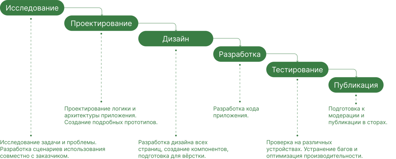 Всё начинается с плана: исследуем, проектируем, моделируем. И только после этого переходим к созданию приложения, тестированию и публикации в сторах. Продуманный старт — залог сильного результата.
