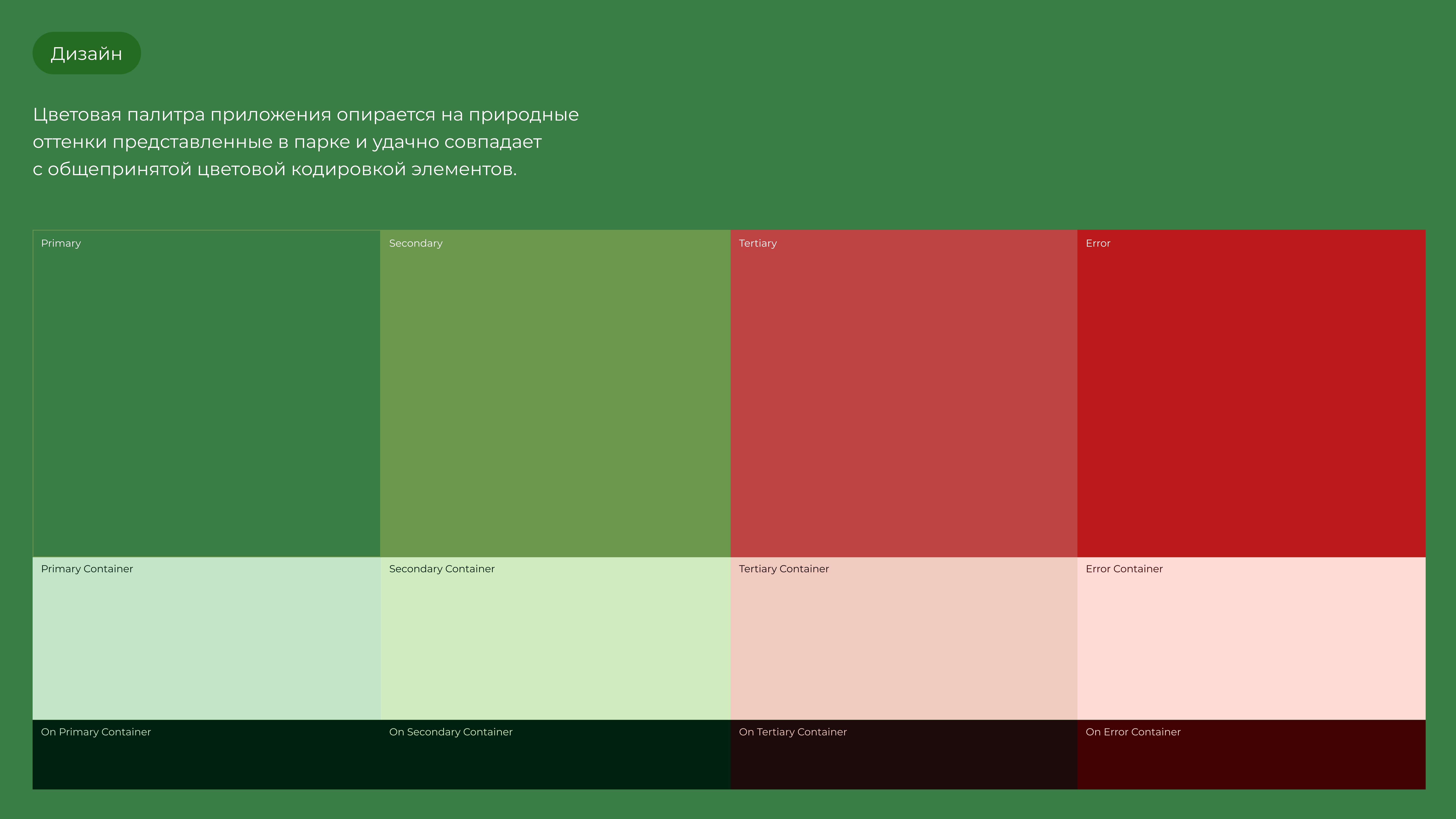 Цветовая палитра приложения опирается на природные оттенки, представленные в парке, и удачно совпадает с общепринятой цветовой кодировкой элементов.