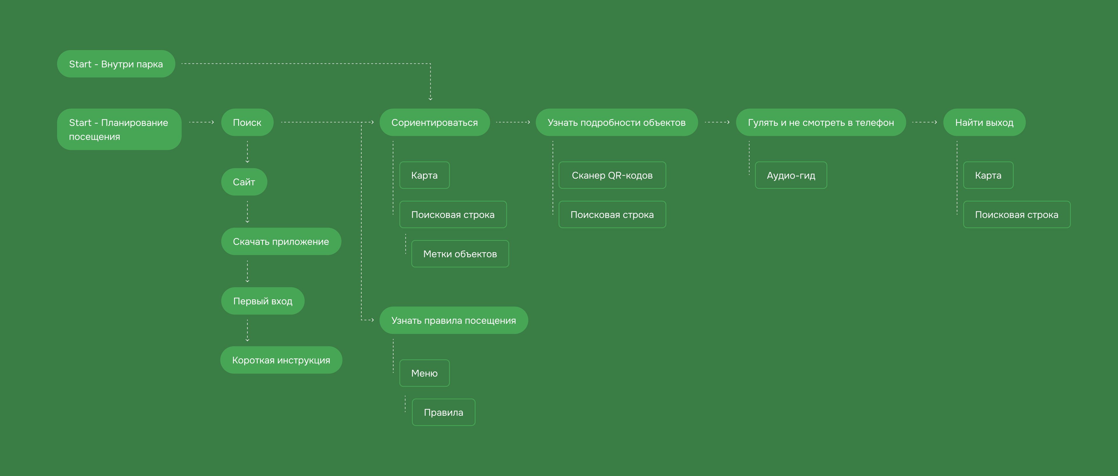 Прежде чем приступить к дизайну, мы провели глубокое погружение в поведение и ожидания пользователей. Изучили сценарии взаимодействия с парком — как при планировании визита, так и на его территории.