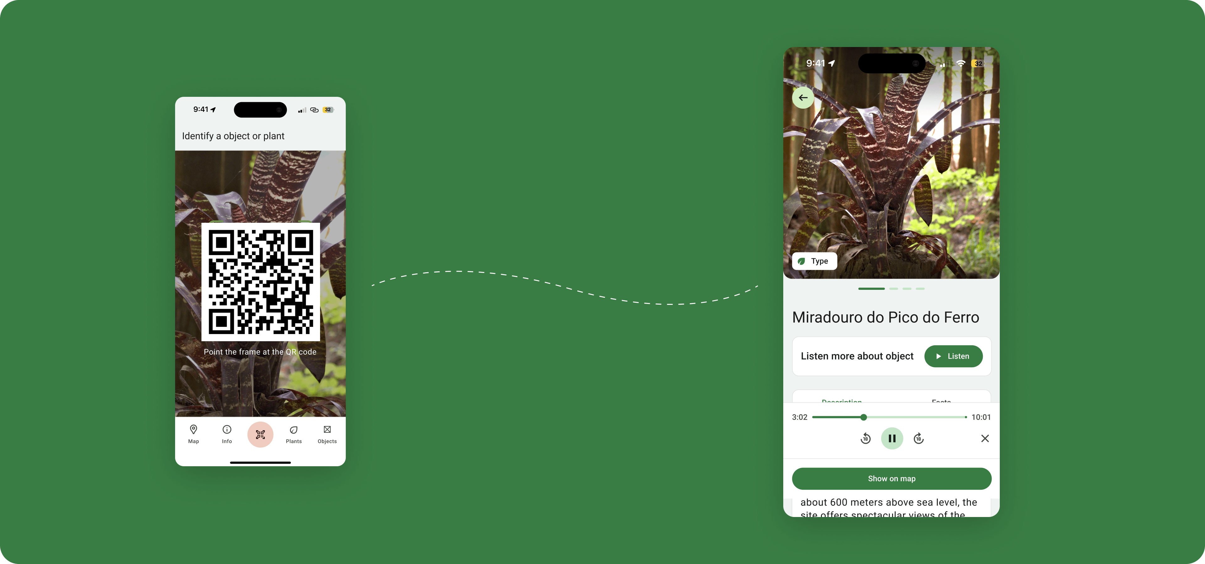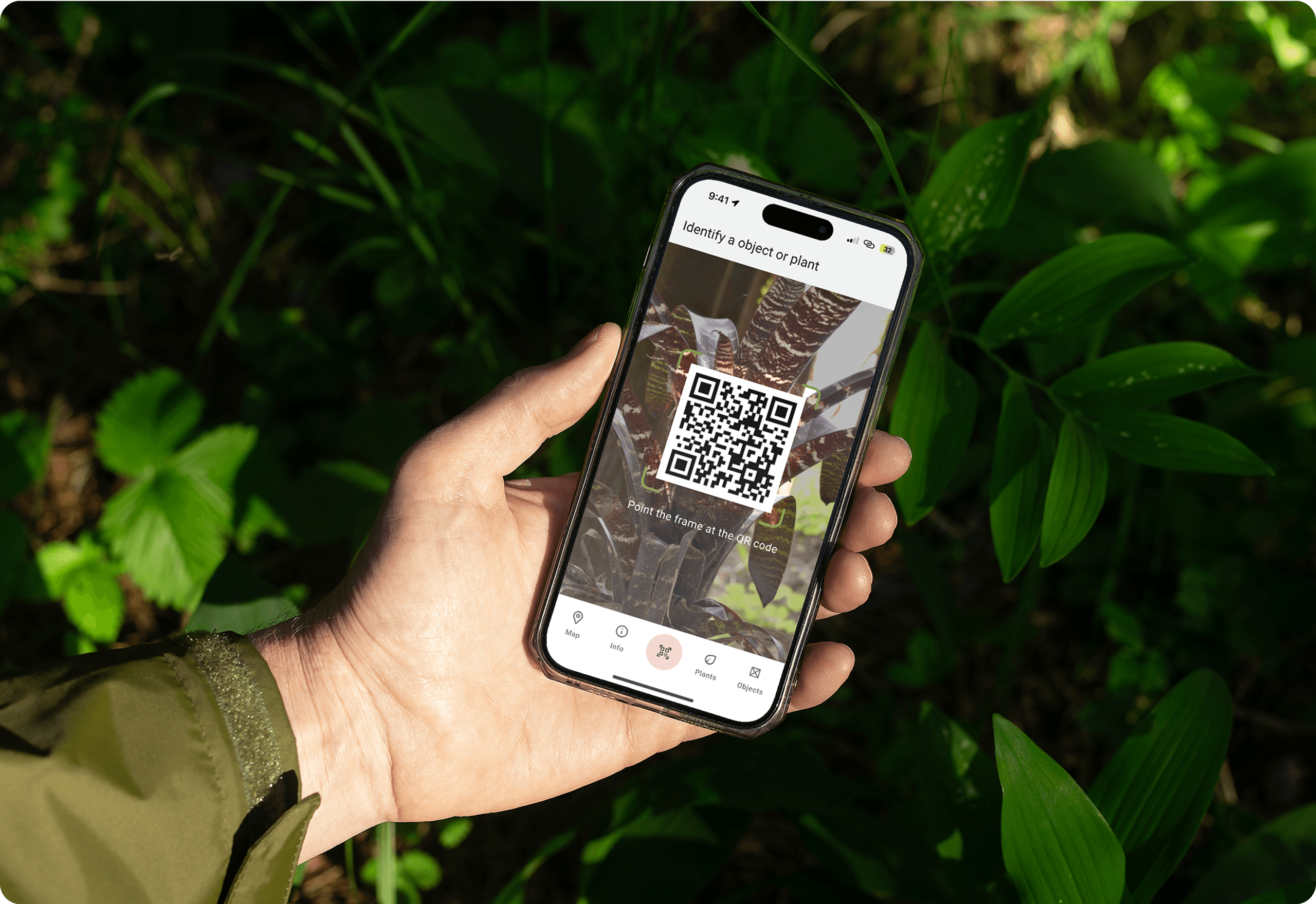 Одна из ключевых функций, которую мы реализовали — посетитель может отсканировать QR-код на табличке и узнать об объектах парка. Можно почитать или послушать. Даже если нет интернета.