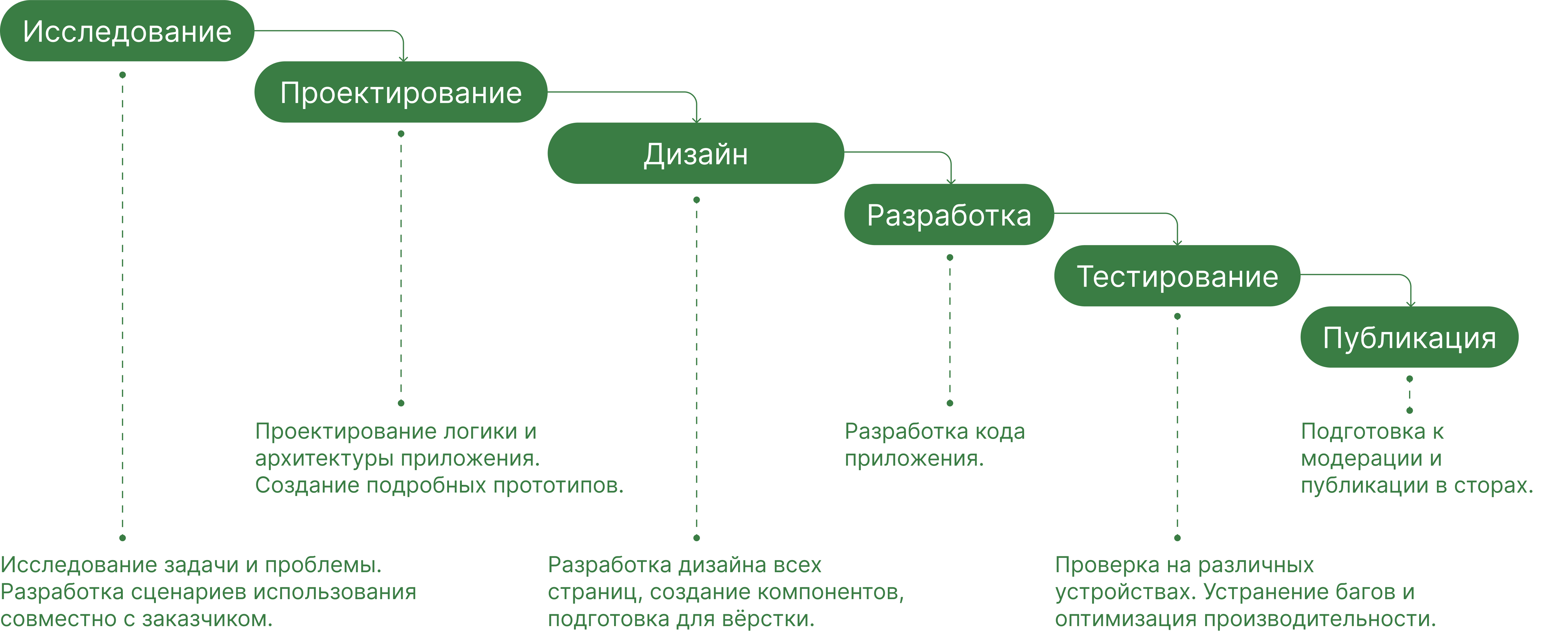 Всё начинается с плана: исследуем, проектируем, моделируем. И только после этого переходим к созданию приложения, тестированию и публикации в сторах. Продуманный старт — залог сильного результата.