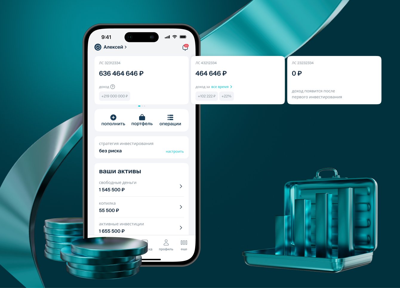 На главной странице пользователи могут переключаться между счетами, пополнять их, просматривать историю операций, изучать портфель и выбирать стратегию инвестирования.