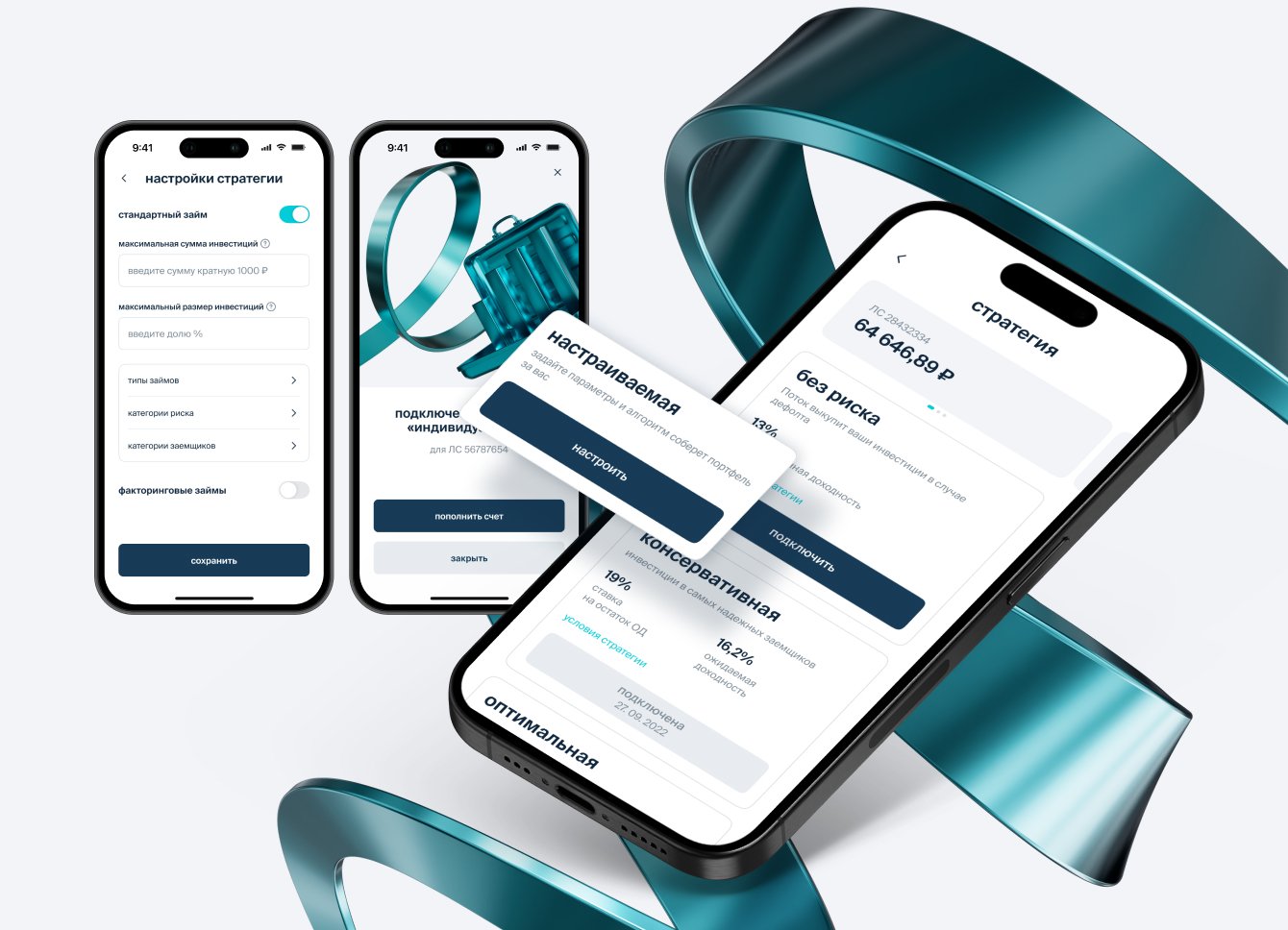 Есть два сценария: выбрать готовую стратегию в один тап или настроить свою. Можно указать тип займа, максимальную сумму инвестиций, уровень риска и долю в портфеле.