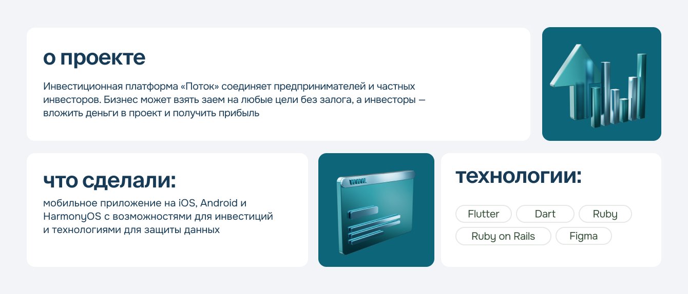 С самого начала мы поставили перед собой цель выбрать не просто подрядчика, но найти эксперта в области мобильной разработки, который поможет нам учесть все нюансы при запуске, так как соответствующей экспертизы внутри нашего IT-отдела не было. До этого мы развивали только веб-интерфейс платформы. В результате тщательного анализа прошлых работ и проведенного тендера выбор пал на Friflex. За 7 месяцев мы реализовали с командой Friflex достаточно сложное мобильное приложение на Flutter — Поток Инвестиции, которое уже доступно во всех сторах.