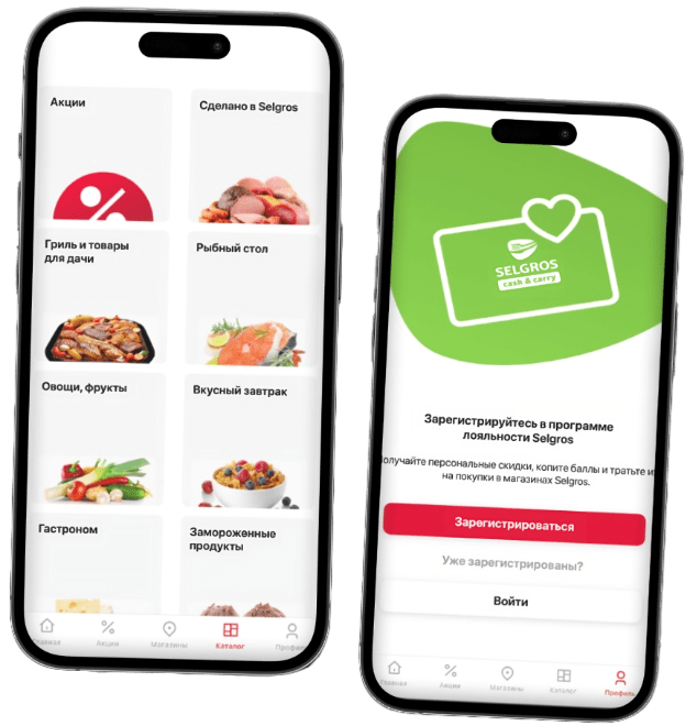 Разработать удобное мобильное приложение для магазина Selgros Cash&Carry, которое помогает клиентам стать новыми клиентами, предоставляет доступ к программе лояльности и удобно использовать для людей 40-45+. С возможностью масштабироваться в полноценный eCommerce проект.