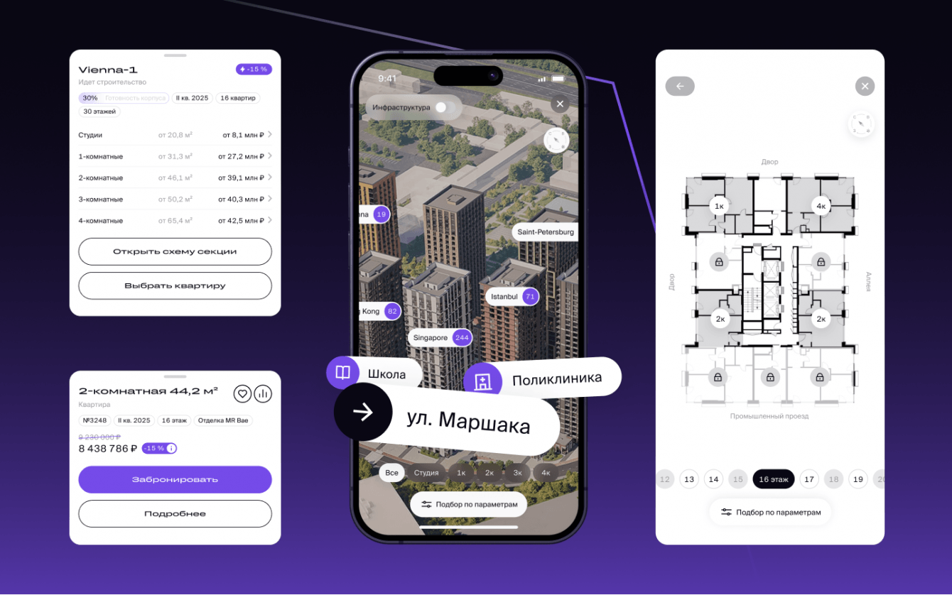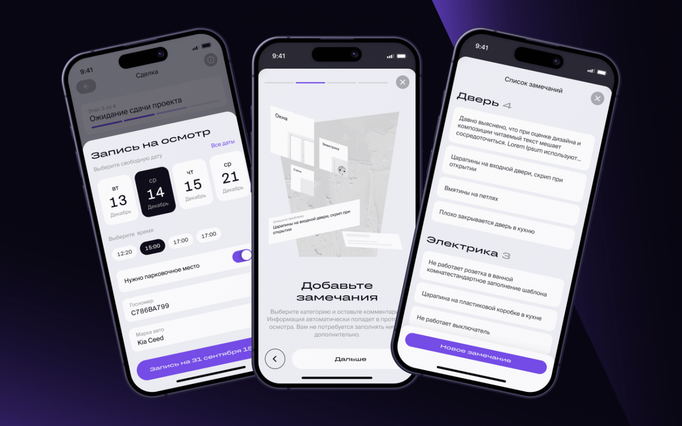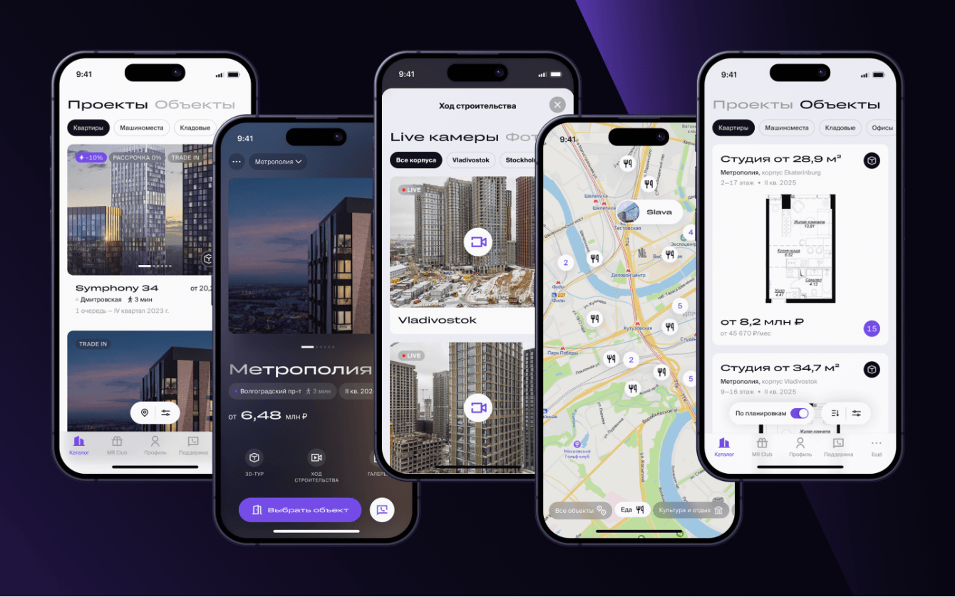 На данный момент реализован первый этап – запущено мобильное приложение клиента (на iOS и Android) закрывающее этапы сделки покупки квартиры: