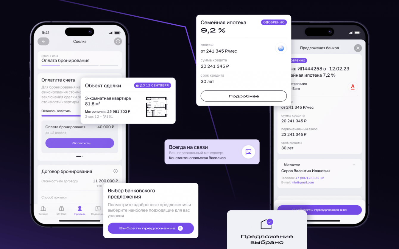 – Автоматизированы этапы прохождения сделки (платное бронирование, оформление договора (в том числе оформление ипотеки), ожидание сдачи проекта, запись на приёмку) с отображением актуальной для текущего этапа информации; возможность быстрой связи с менеджерами на любом этапе выбора объекта недвижимости и при возникновении любых вопросов. Бронирование объекта недвижимости как запуск процесса покупки.