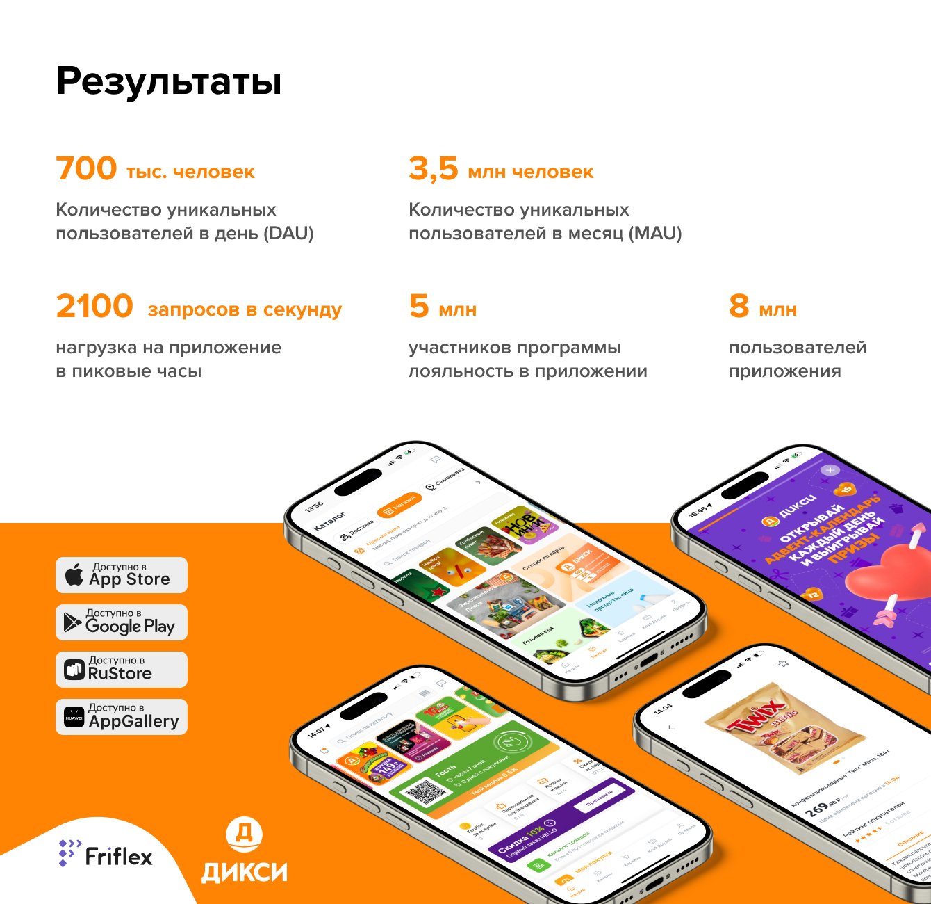 Для приложения сети магазинов «Дикси» команда Friflex использовала кроссплатформенную разработку на Flutter — приложение разрабатывалось сразу для двух платформ, Android и iOS (а потом было опубликовано и в App Gallery и Rustore), что позволяло экономить время и бюджет, а в дальнейшем — быстрее релизить новые функции. «Дикси» — одно из первых приложений на Flutter в российском ритейле.