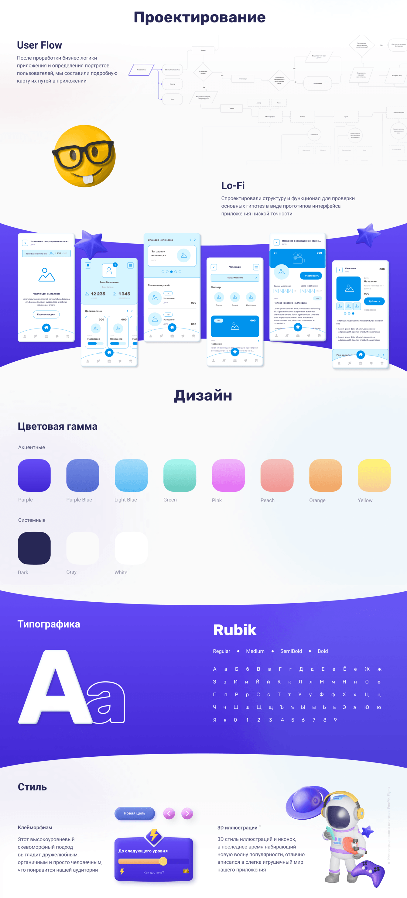 Основной этап проектирования, начиная от визуального представления пути пользователя, заканчивая разработкой и внедрением всех элементов дизайн-системы в подготовленный макет приложения