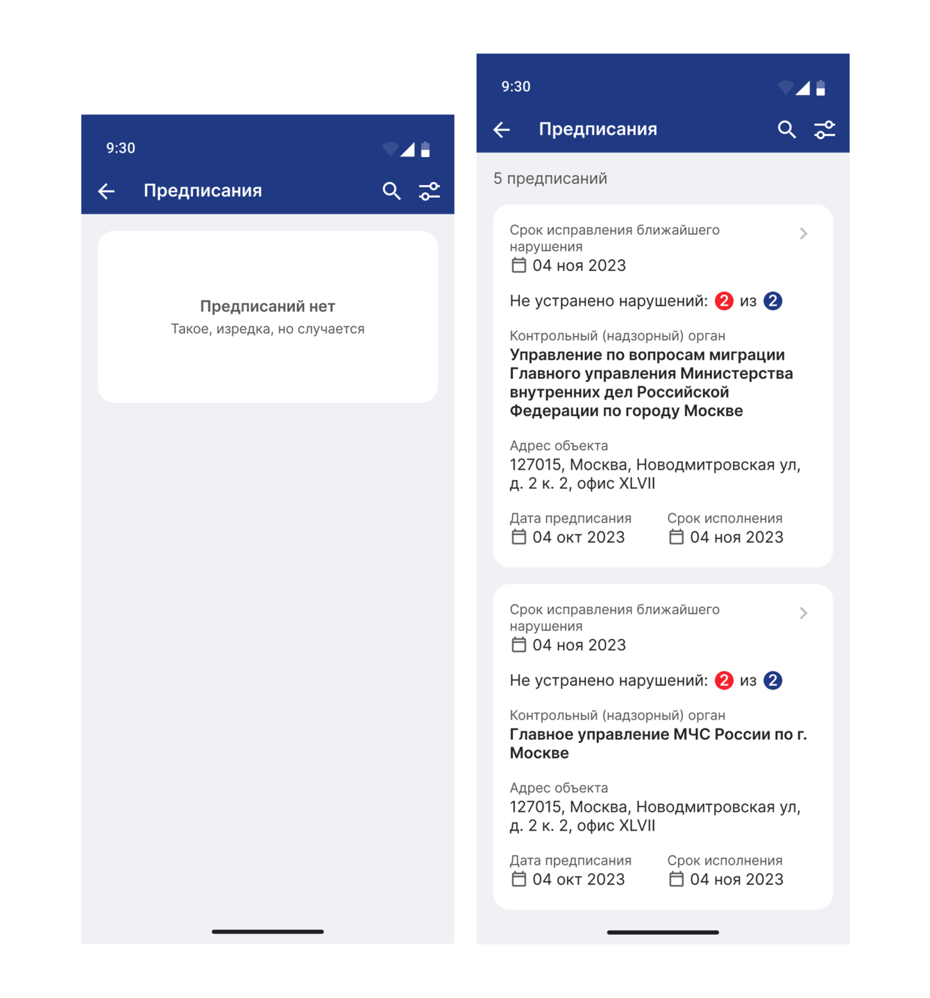 В модуле «Предписания» вы видите список всех таких нарушений с дедлайнами и способами устаранения.