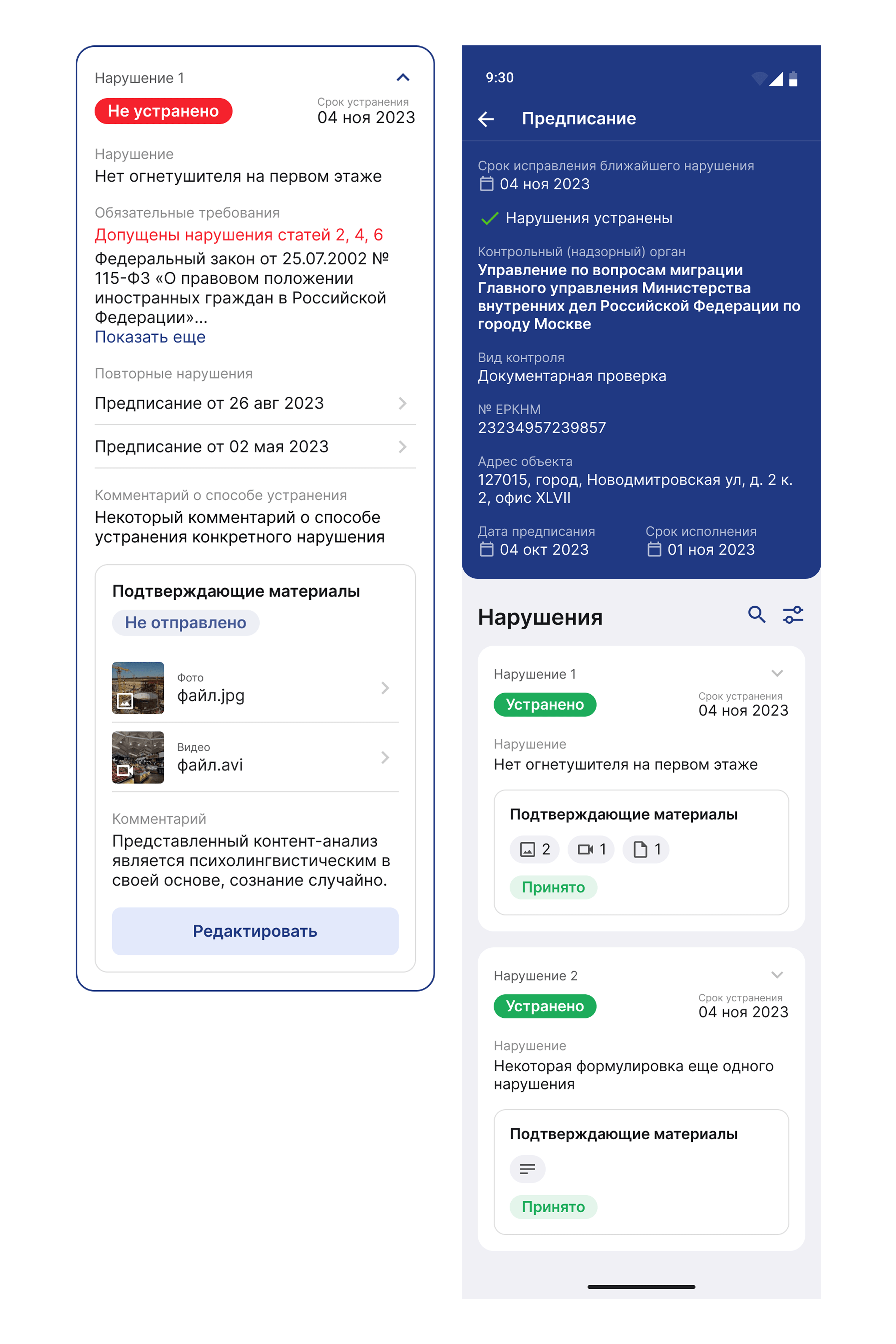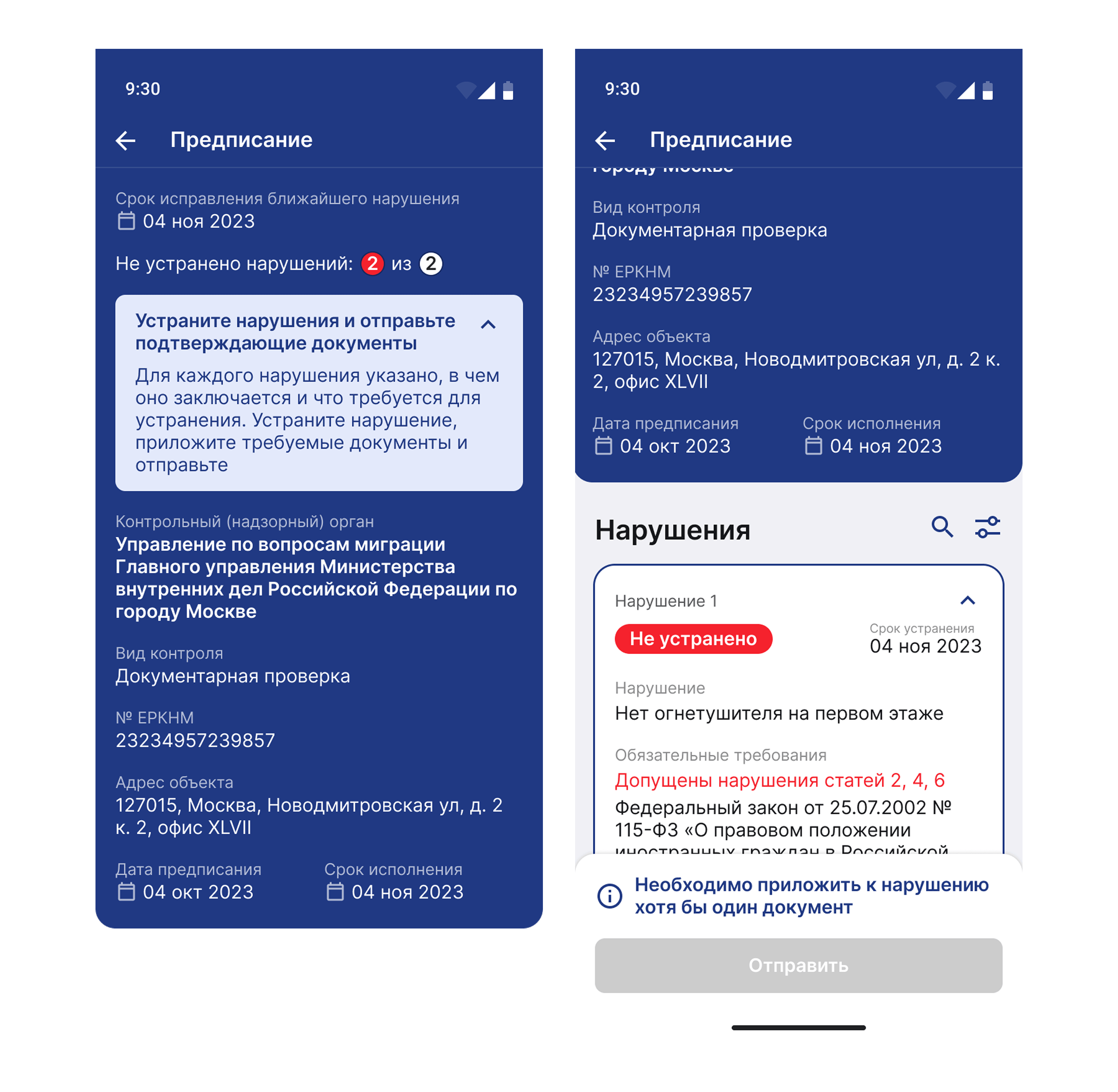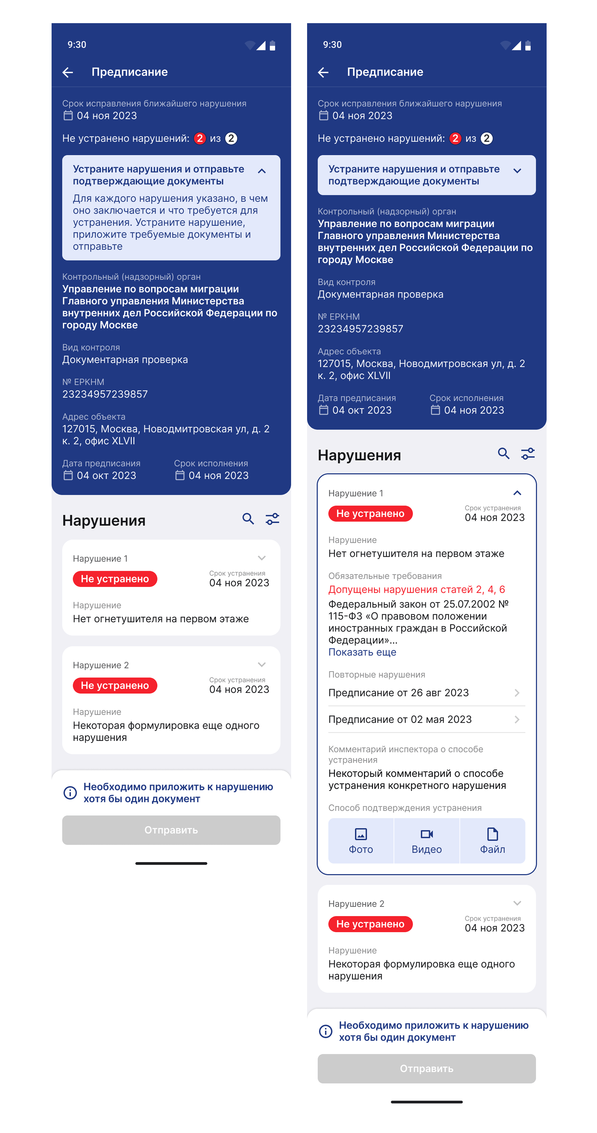 Новый раздел мобильного приложения для госконтроля упрощает взаимодействие инспектора и контролируемого лица. Перечень нарушений, требования, статус и сроки исправления наглядно представлены в приложении, а отчитаться об устранении нарушений и предоставить подтверждающие материалы можно в несколько кликов.