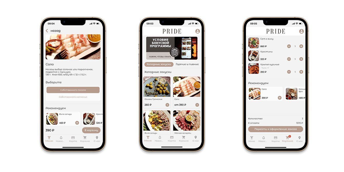Для ресторана «PRIDE» специалистами Платформы был разработан индивидуальный дизайн приложения: цветовая схема, отображение основного экрана, иконки приложения и адаптация логотипа.