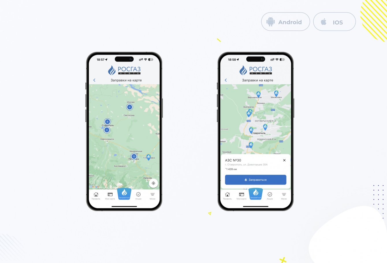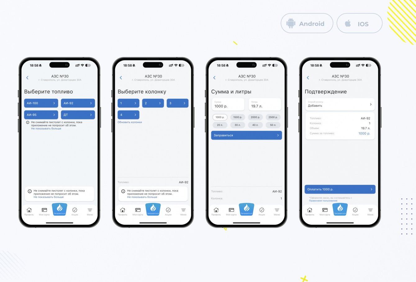 Задачей данного проекта было создать мобильное приложение для сети заправок ставропольского края, с помощью которого пользователи смогли бы заправиться через приложении не выходя из автомобиля, а также создать электронную карту лояльности с возможностью показывать ее на кассе через приложения, не используя пластик.