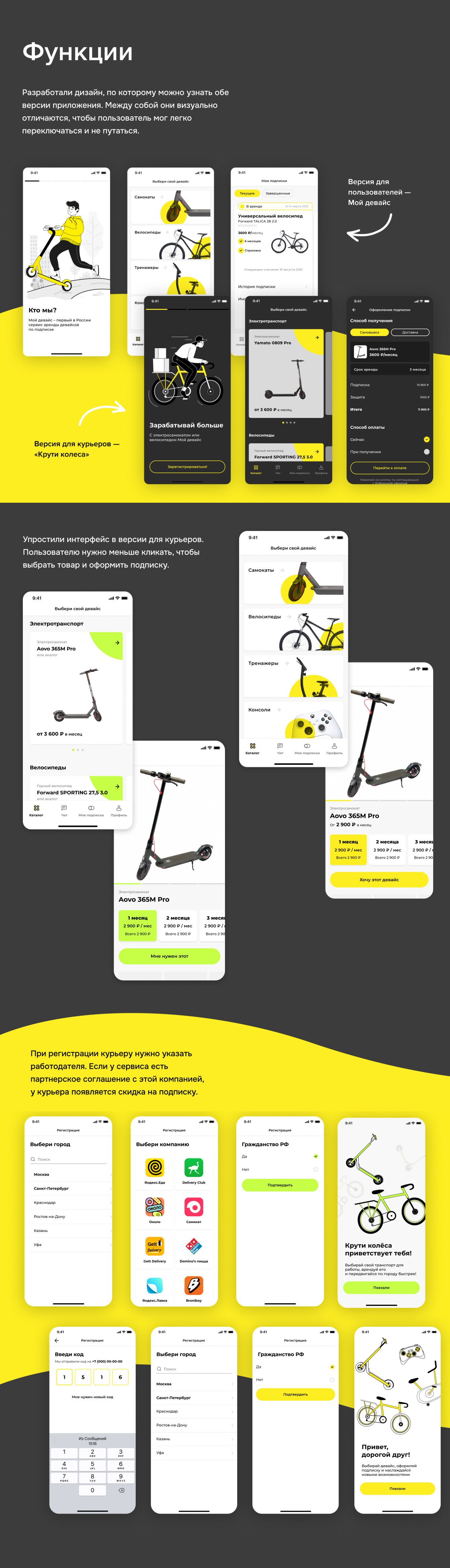 Компания Мой девайс запустила сервис с двумя направлениями. Приложение для пользователей, которые арендуют технику для себя, называется Мой девайс. Мобильное решение для курьеров, которым нужен мобильный транспорт для работы, называется «Крути колеса».