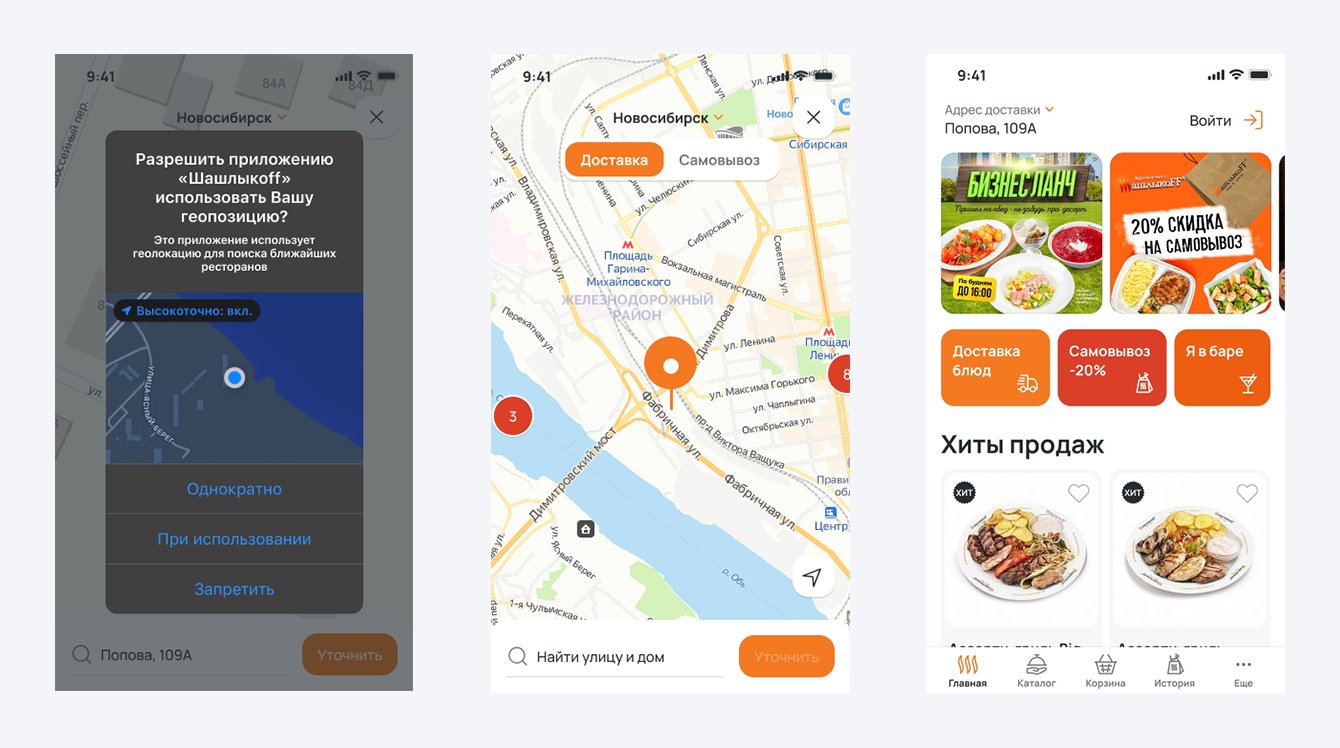 2) Локализация каталога меню для доставки. Мы разработали новую логику формирования меню для доставки клиенту. Так, на основании адреса пользователя приложение определяет бар, из которого будет осуществляться доставка. Система самостоятельно проверяет наличие того или иного блюда в баре и в зависимости от этого формирует меню. Те позиции, которых нет в наличии в данном баре, пользователю не отображаются.
