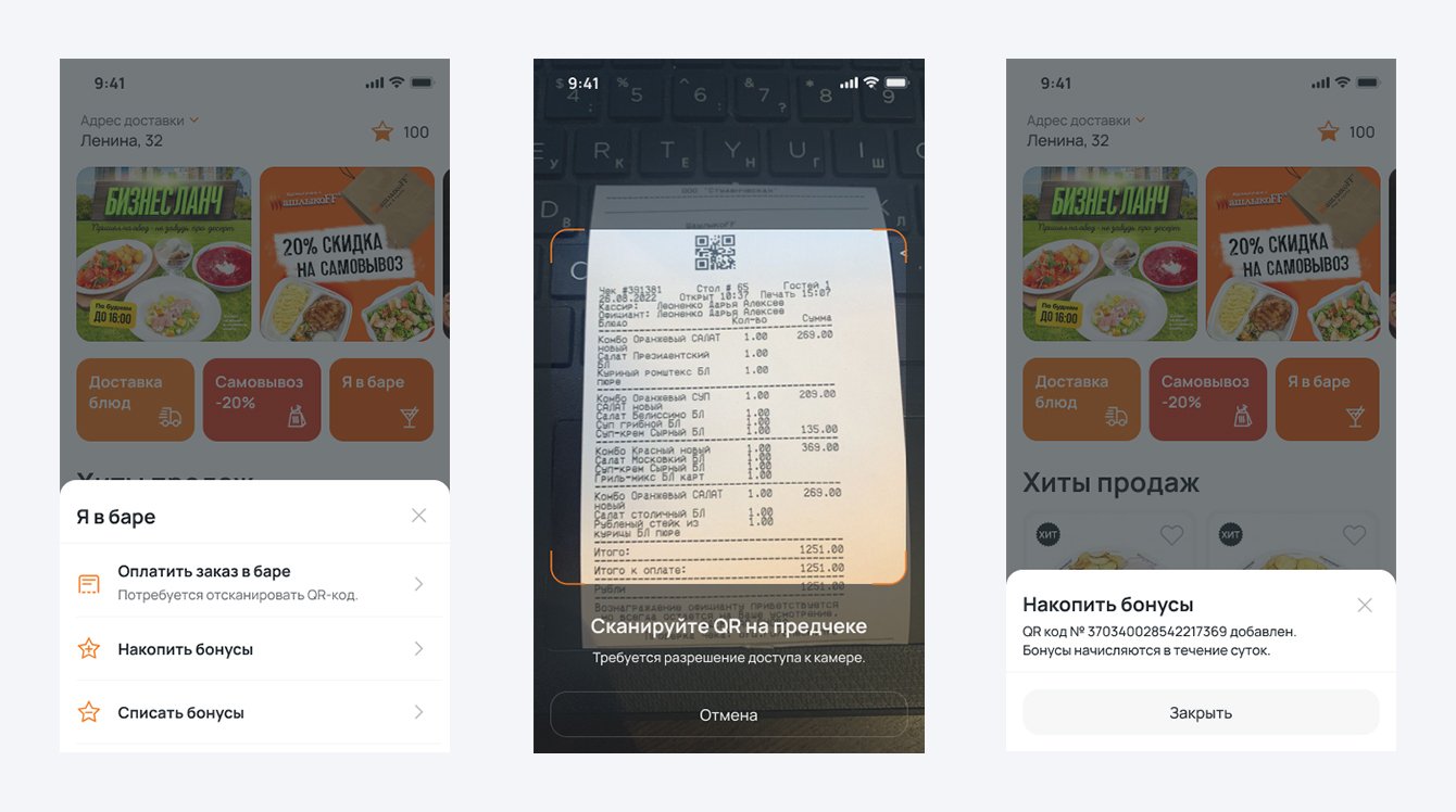 3) Гибкая бонусная система. Мы разработали бонусную систему, которой можно пользоваться как при посещении офлайн-бара, так и при заказе блюд в мобильном приложении. При оплате заказа в офлайн-баре пользователь может отсканировать QR-код с “предчека” — ему начислятся бонусы за заказ, либо он может назвать код из приложения официанту — тогда бонусы будут списаны для оплаты текущего заказа. При оформлении заказа в мобильном приложении пользователь также может начислять баллы или списывать их со счета.