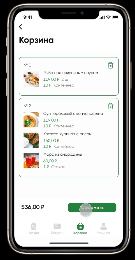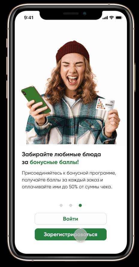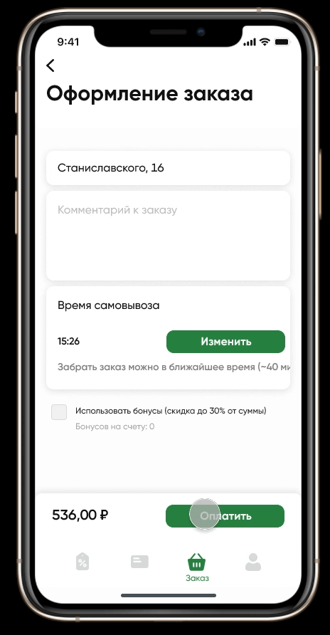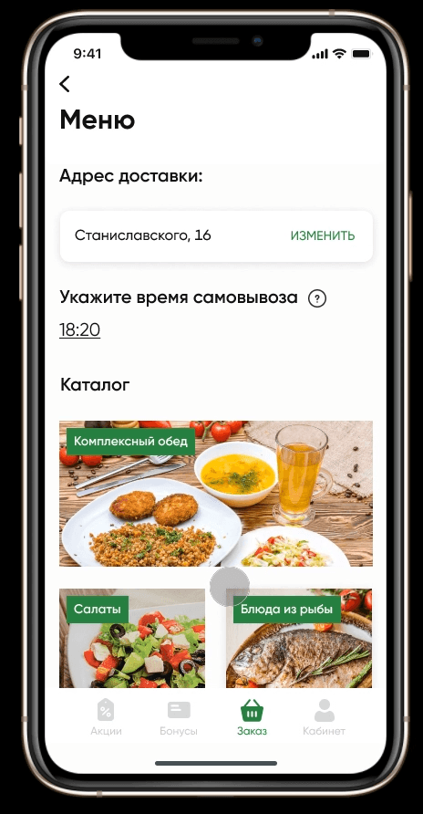 Пользователи могут авторизоваться и заходить в личный кабинет: там будет отображаться информация о клиенте, а также бонусный счет в программе лояльности. В меню можно выбрать понравившиеся блюда или комбо-наборы, в корзине отобразится заказ и итоговая сумма. Завершив оформление, пользователь выбирает время и точку для самовывоза. Также добавили функцию пуш-уведомлений: пользователи получают информацию об изменениях в заказе и маркетинговую рассылку.
