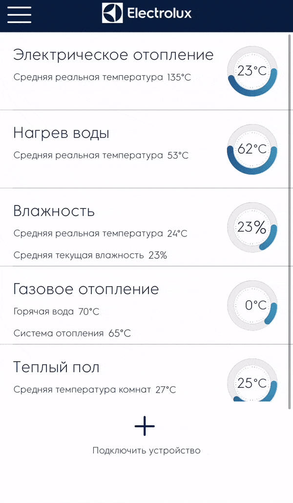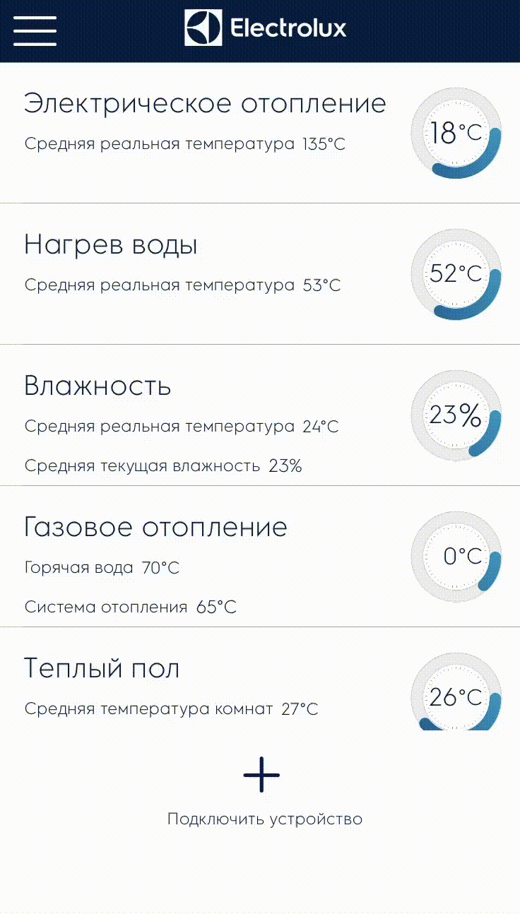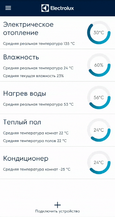 Приложение Electrolux Home Comfort управляет кондиционированием, тёплыми полами, отоплением, водонагревателями и увлажнителями воздуха. Вместо нескольких пультов — одно приложение, которое согласованно управляет разные устройства и наглядно показывает состояние их работы. Если под рукой оказался пульт и вы с его помощью изменили настройки, всё синхронизируется в приложении.