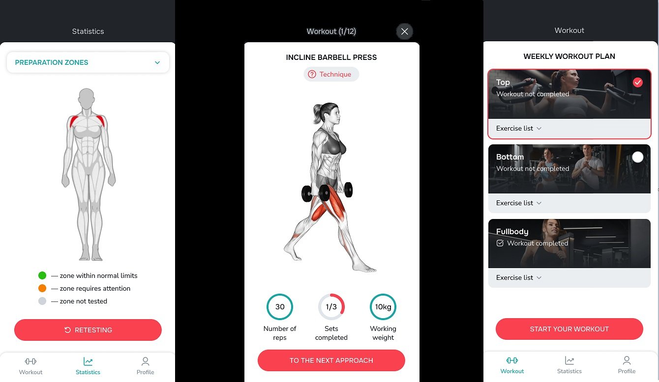 По итогу наших работ, клиент получил рабочее MVP фитнес-приложения, которое адаптирует программу тренировок для каждого клиента. В приложении реализовано:
