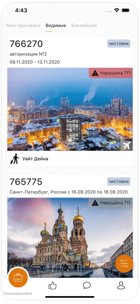 Должно включает в себя просмотр всех доступных командировок, ближайших командировок, авторизацию командировок и чат бот.