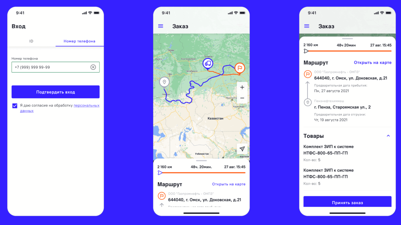 - Есть карта с просмотром и подтверждением маршрута по доставке грузовой партии;