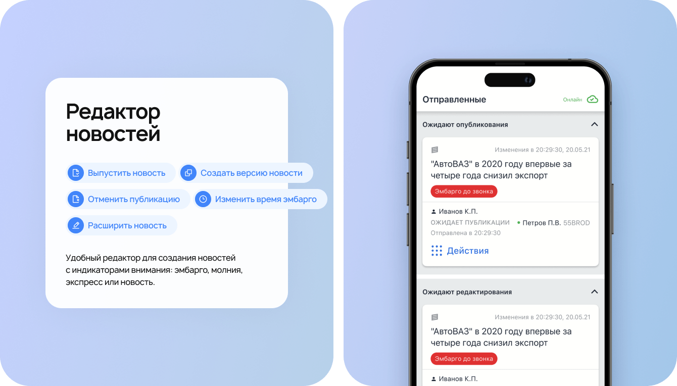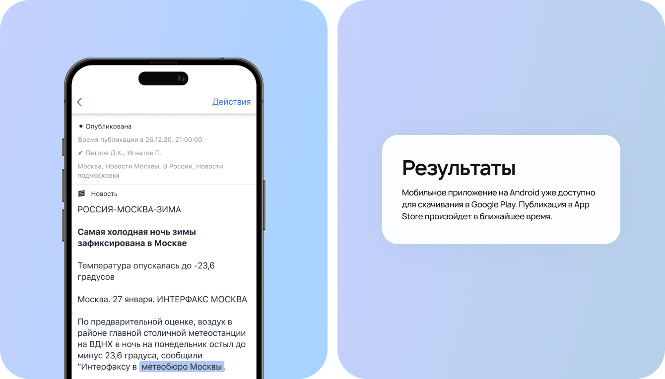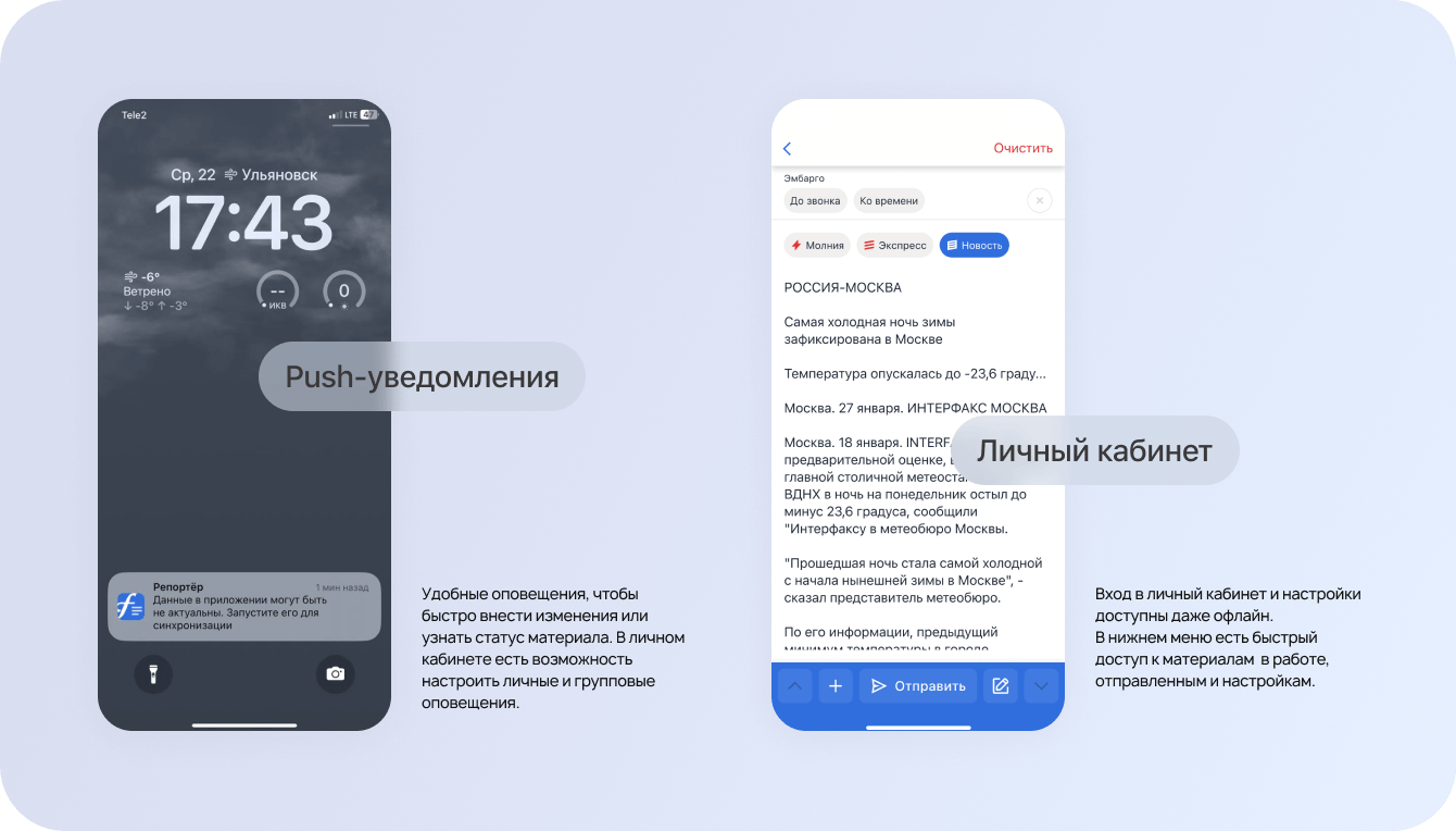 Это первое российское решение для работы журналистов, чтобы выпускать новости в любых условиях и быстрее других. Журналист пишет и форматирует материал в мобильном приложении по требованиям редакции даже при отсутствии интернета, и текст автоматически отправляется при появлении сети.