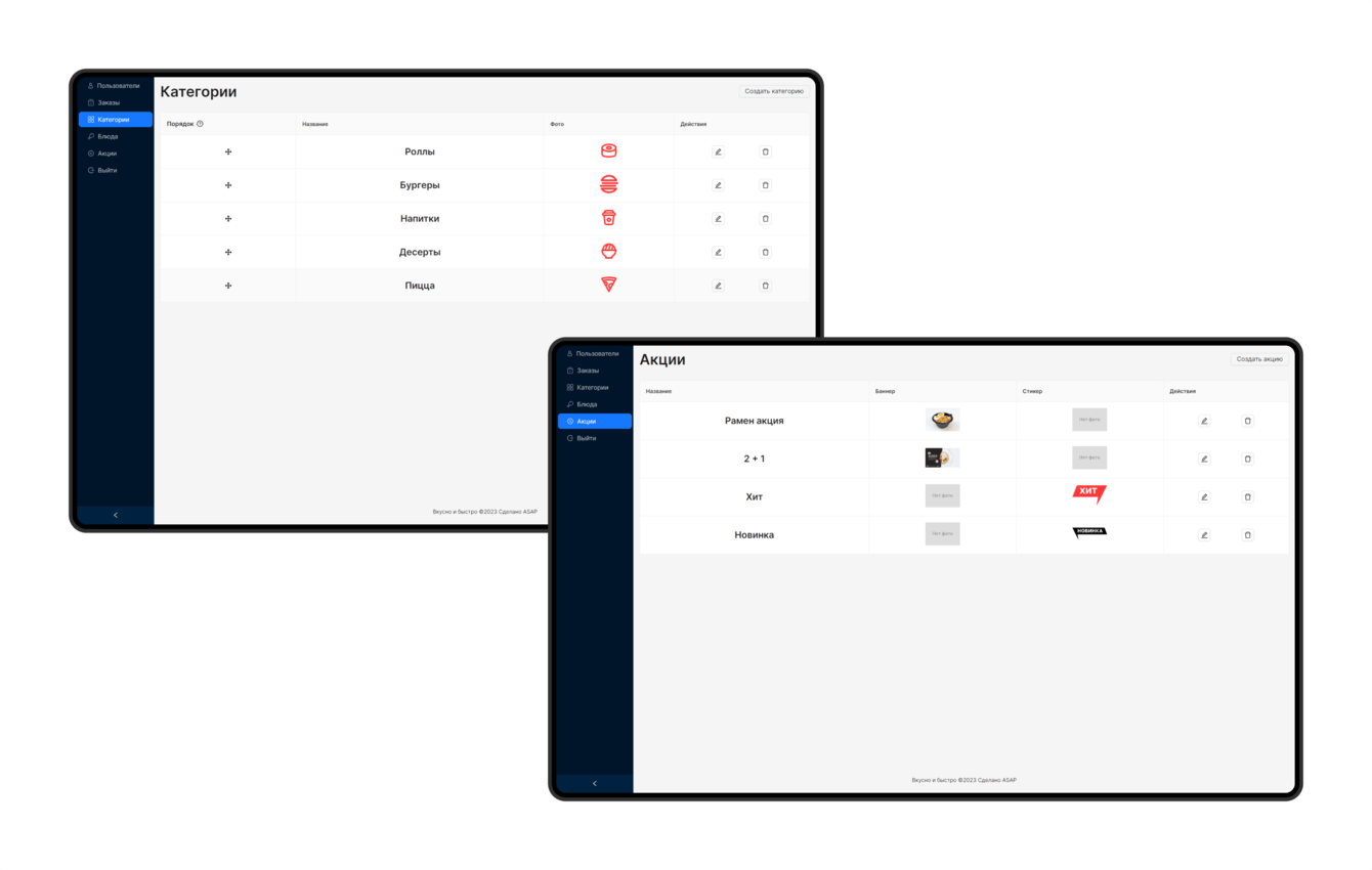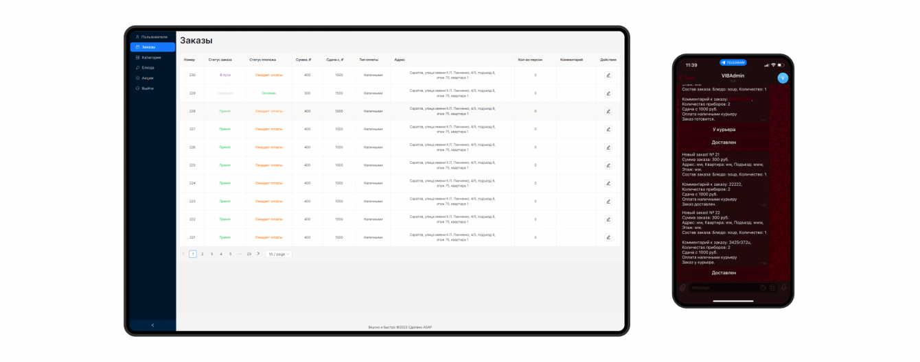 Проект запускался с нуля. Поэтому нам нужно было разработать систему, которая бы автономно организовывала приём заказов и доставку без интеграций со сторонним ПО для управления рестораном.