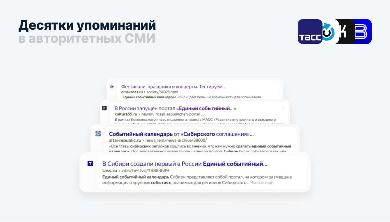 Работе с мобильным приложением предшествовала разработка платформы Единого событийного календаря в ПК-версии. Масштабный агрегатор, ориентированный на взаимодействие с: