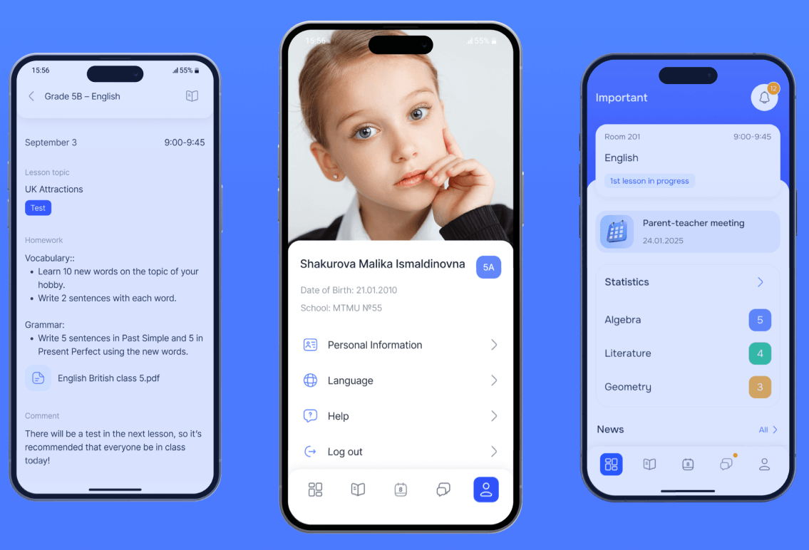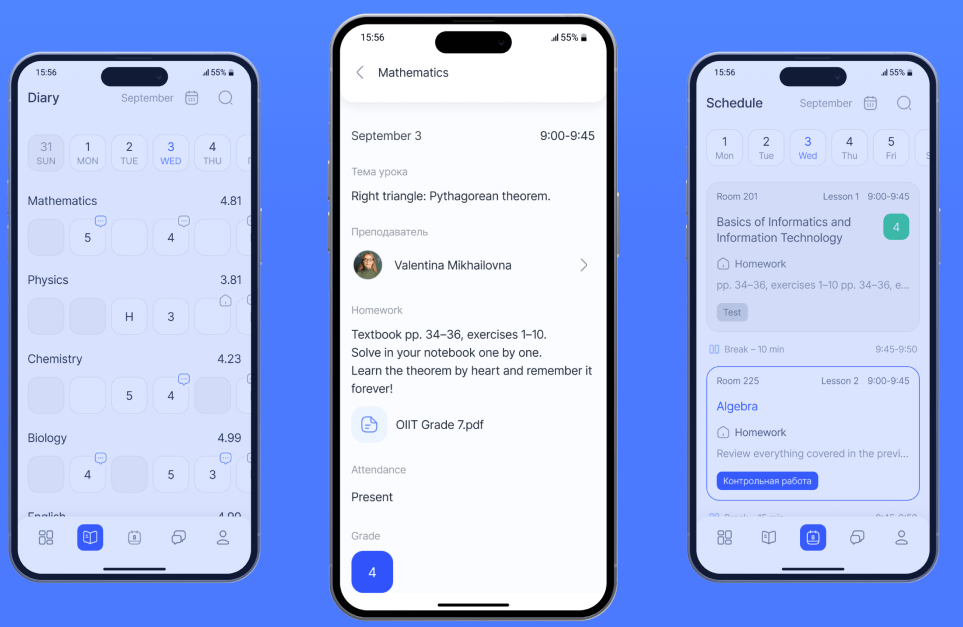 Было необходимо разработать мобильное приложение для сферы образования в Таджикистане, в котором ученики, учителя и родители легко смогут отслеживать все нюансы учебного процесса. Приложение должно включать в себя электронный дневник с расписанием и оценками, указанием тем для домашнего задания, а также чатами.