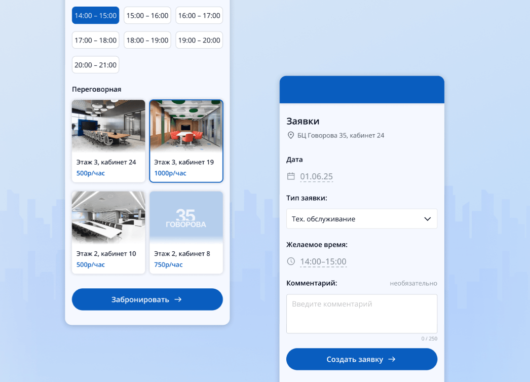 Пользователь должен иметь возможность бронировать парковочные места и переговорные комнаты, заказывать услуги в офис, оставлять заявки на техобслуживание и оформление пропуска.