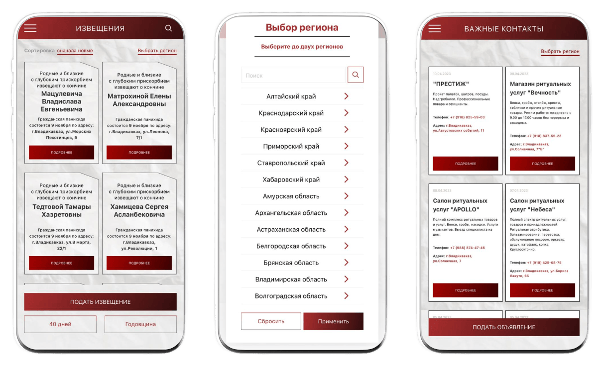 С помощью приложения можно найти ритуальное агентство, кейтеринговую фирму или салон ритуальной фотографии. Примечательно, что сортировка списка из этих услуг идет по региону, то есть пользователь, зайдя в приложение, может сам легко выбрать свой регион из списка.