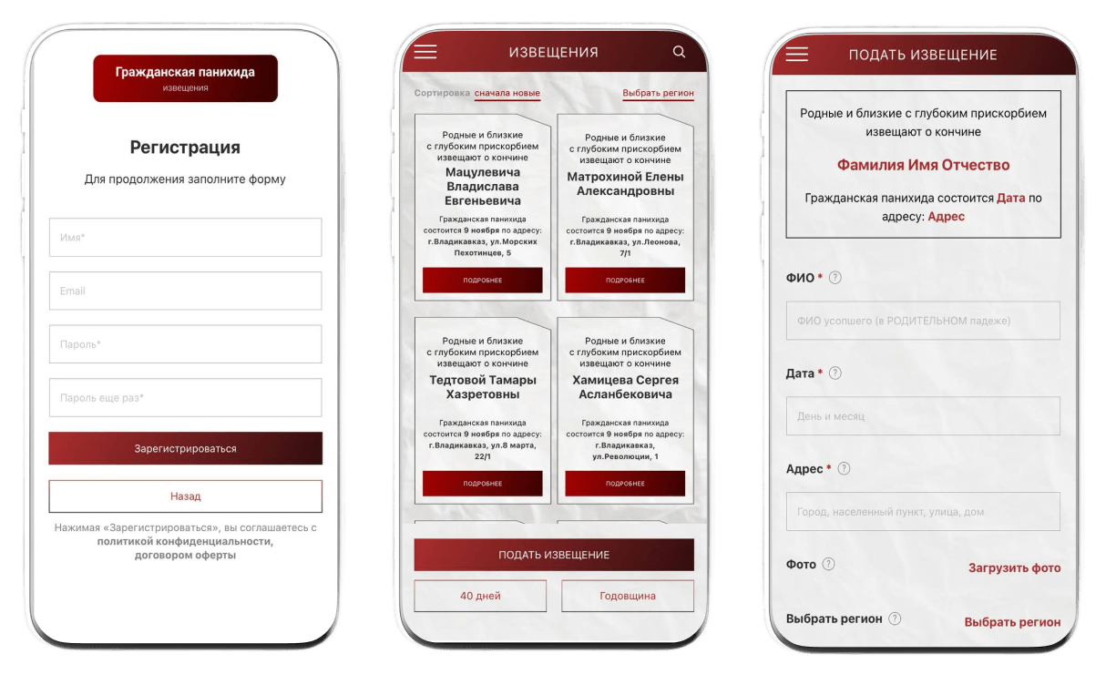 Создали мобильное приложение, в котором пользователи имеют возможность самостоятельно публиковать извещения о проведении гражданской панихиды и иных поминальных мероприятий, времени и месте их проведения, а также выражать соболезнования другим пользователям по поводу их утраты.