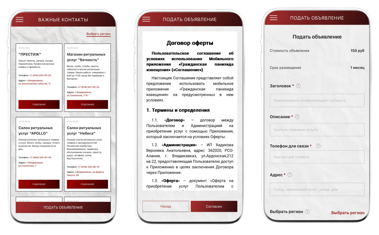 Помимо основного функционала мы учли и дополнительные услуги, которые могут быть полезными для родственников и близких умерших. Например, в разделе «Важные контакты» можно найти ритуальное агентство, кейтеринговую фирму или салон ритуальной фотографии. Если же вы оказываете ритуальные услуги, то за небольшую плату сможете прямо в приложении разместить свое объявление.